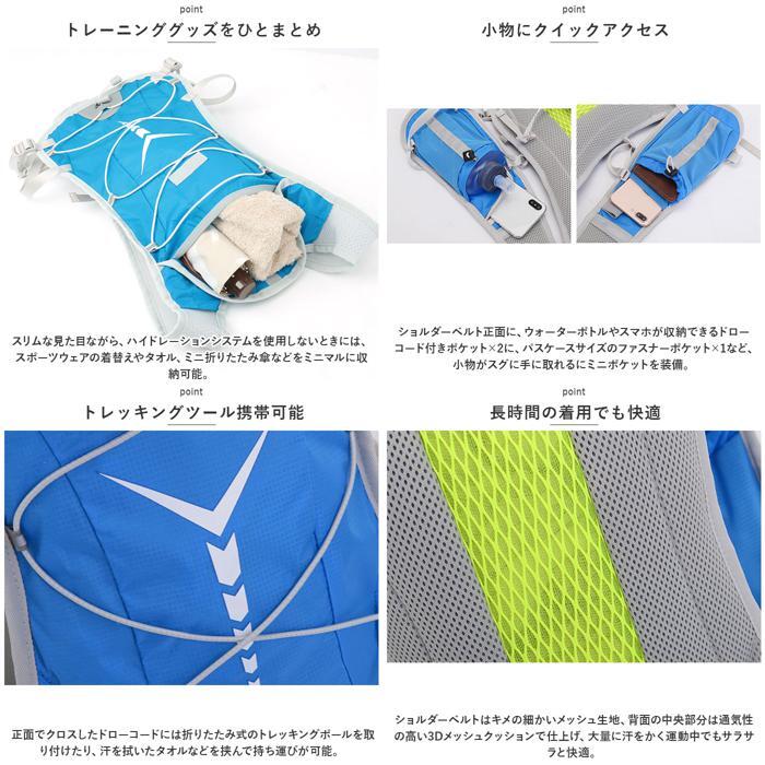| 商品説明 | ・・競技中の身体にピタッとフィットするスリム設計!ランニングやトレイルランなど、スポーツシーンで活躍する「超軽量 ランニングリュック」が新登場。 ・【フィット感抜群のベスト型】 ・軽量な生地使いと、ベストのようなスマートなフォルムで、ドリンクやスマホなどの必須アイテムを競技に影響を与えずに持ち運ぶことが可能! ・【ハイドレーションシステム対応】 ・面ファスナーフラップで開くメインルーム内側に、ハイドレーションシステム用ポケットを配置。競技中でも両肩の給水ホース穴から水分補給が可能。(※ハイドレーションシステムとはリュックサック内の袋に飲料を入れ、背中から口許まで伸びるチューブによって給水する仕組みのこと。) ・【トレーニンググッズをひとまとめ】 ・スリムな見た目ながら、ハイドレーションシステムを使用しないときには、スポーツウェアの着替えやタオル、ミニ折りたたみ傘などをミニマルに収納可能。 ・【小物にクイックアクセス】 ・ショルダーベルト正面に、ウォーターボトルやスマホが収納できるドローコード付きポケット×2に、パスケースサイズのファスナーポケット×1など、小物がスグに手に取れるにミニポケットを装備。 ・【トレッキングツール携帯可能】 ・正面でクロスしたドローコードには折りたたみ式のトレッキングポールを取り付けたり、汗を拭いたタオルなどを挟んで持ち運びが可能。 ・【長時間の着用でも快適】 ・ショルダーベルトはキメの細かいメッシュ生地、背面の中央部分は通気性の高い3Dメッシュクッションで仕上げ、大量に汗をかく運動中でもサラサラと快適。 ・【体型に合わせて調節可能】 ・サイドベルトと上下位置が調整できる2本のチェストバックルでリュックが身体にフィット!ランニング中もズレにくく、競技のパフォーマンスが向上。 ・【キラリと光るリフレクター】 ・リュック前面のドローコードのループやショルダーベルトにリフレクター素材のラインを配置。自動車のライトにキラリと光って、夜間のトレーニングでも大活躍。 |