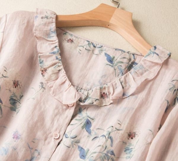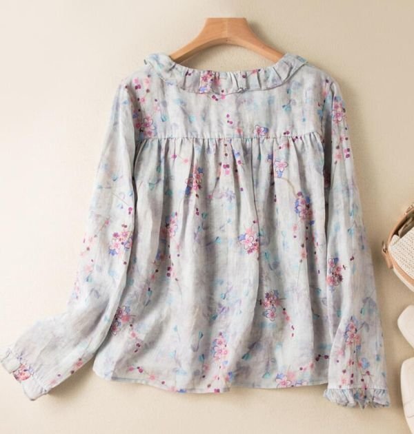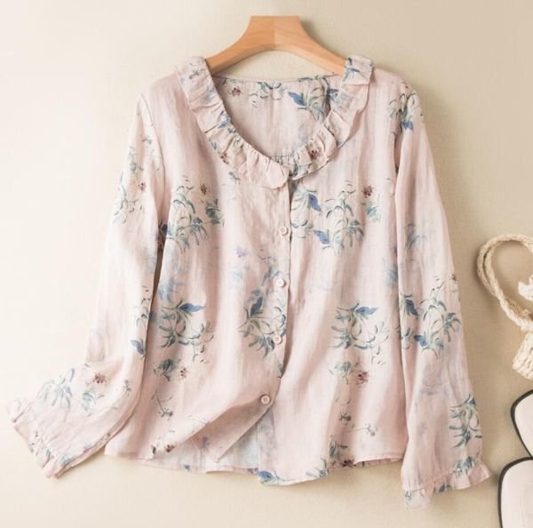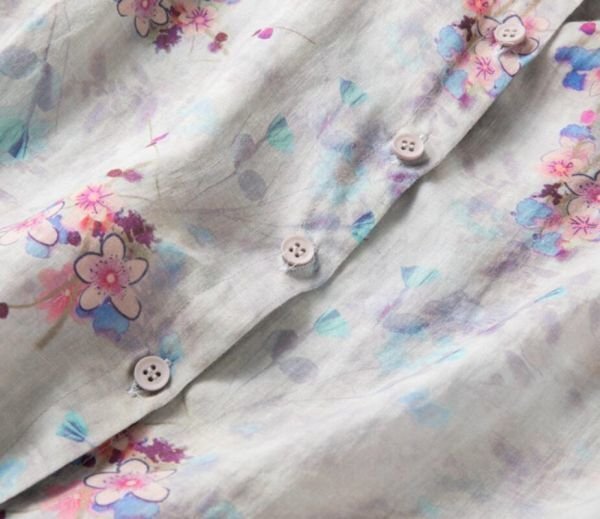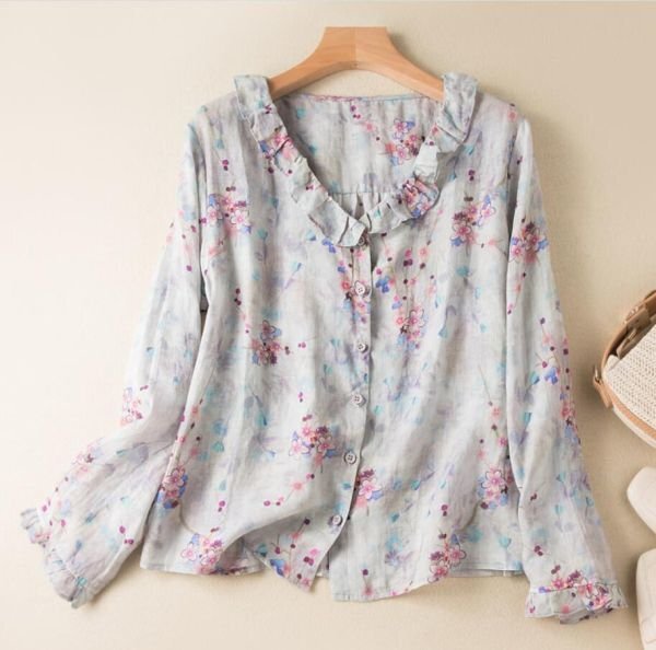 春新品 花柄シャツ 綿麻 レディース 長袖 ブラウス プリント カジュアル 大きいサイズ トップス★ブルー /XLサイズ