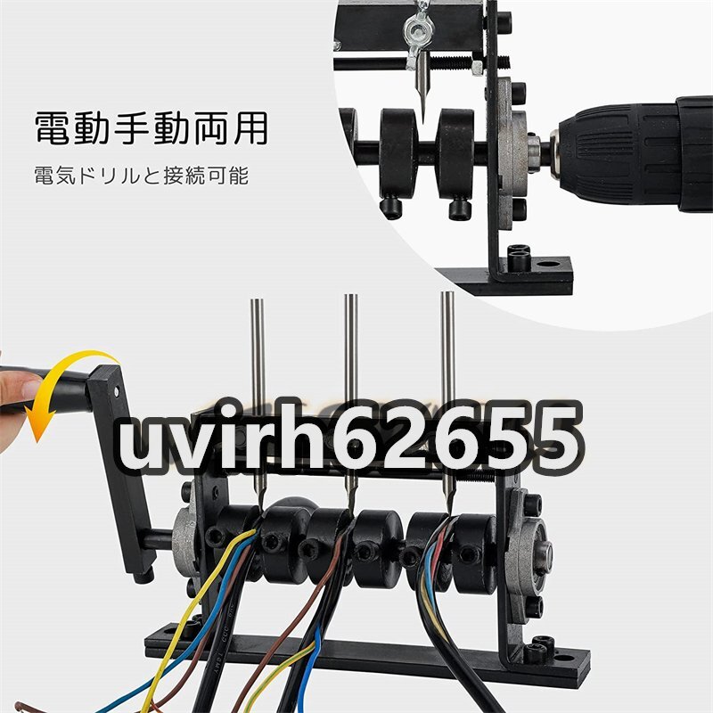 【電動手動両用】フリーハンドクランクがあり、手動で操作でき、家庭や小規模工房など向けです。または、電気ドリル(付属しない)作業を行い、便利で操作が簡単です。手が疲れず、仕事効率を大幅に上がり、電動皮むき機とほぼ同じだが、コストは大幅に下がります。銅線リサイクル業者などに適します。(参考:1 日に約 50 ~ 300 kg のワイヤーをストリッピング可能です。)