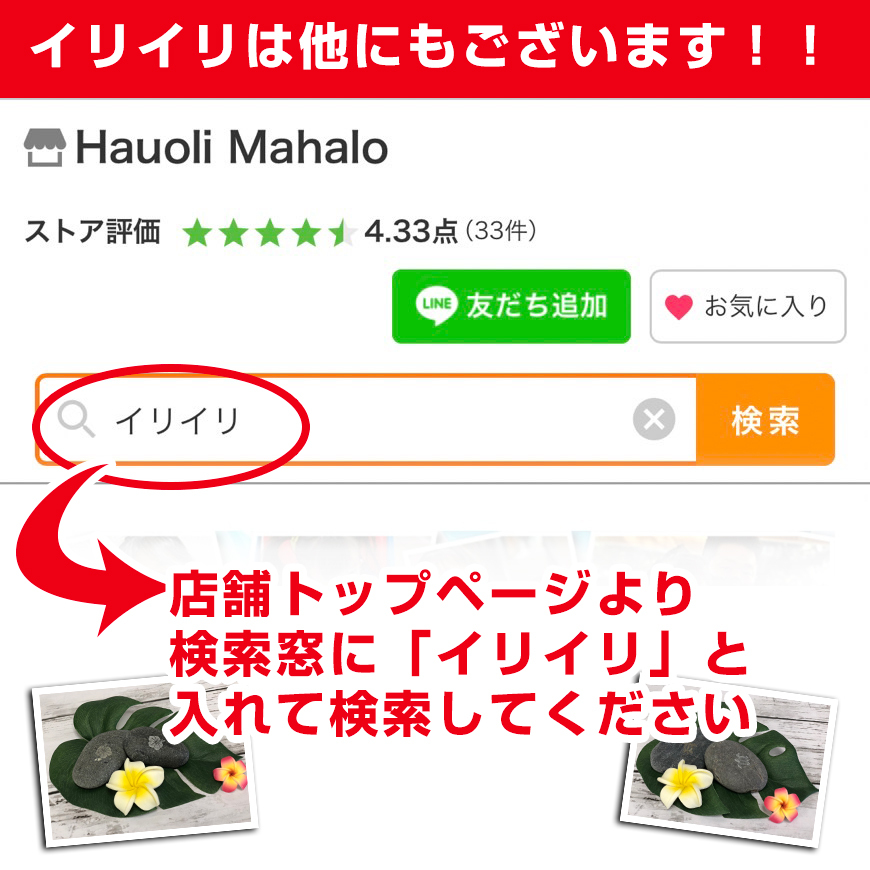| 当店はイベント出店やハワイ出張等、長期のお休みをいただく場合がございます。 お休み中はご注文いただきました商品の在庫確認がとれないため、 商品代金のお振り込みは必ず当店からの在庫確認メールをご確認いただきました後にお願いいたします。 確認メール前にお振り込み頂き、商品の在庫がなかった場合は振り込み手数料を引いた金額を返金致しますので、ご了承のほどよろしくお願い申し上げます。 | |