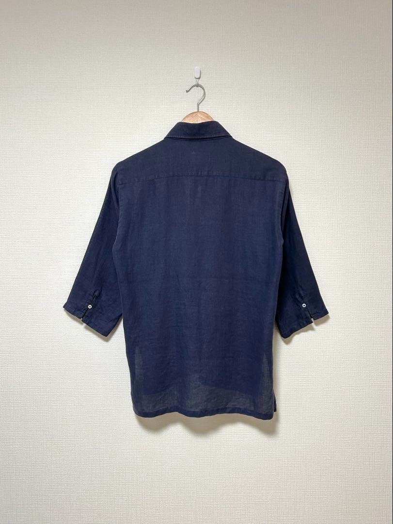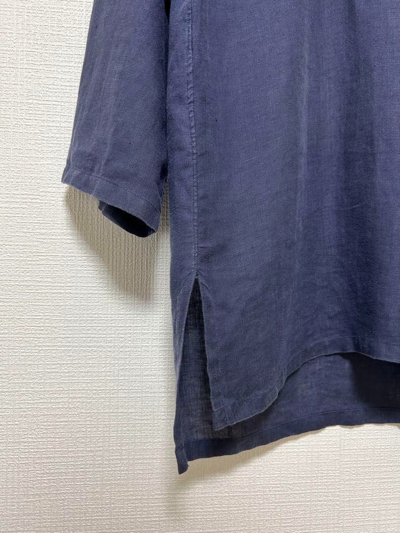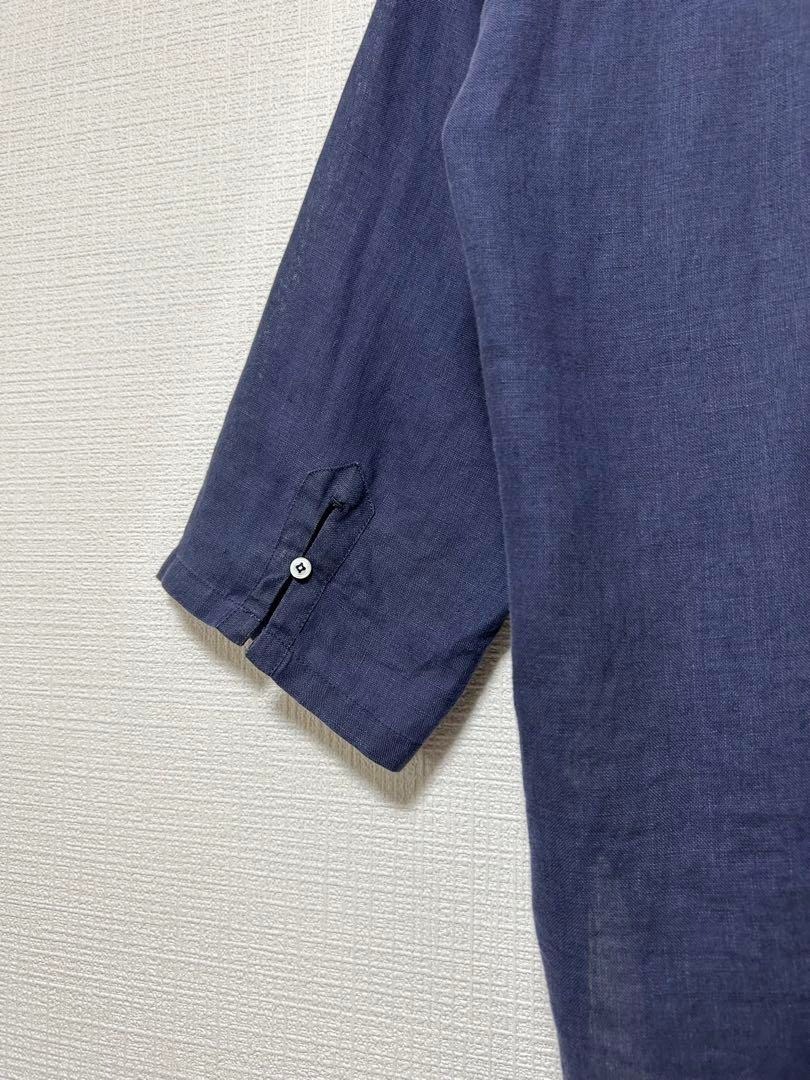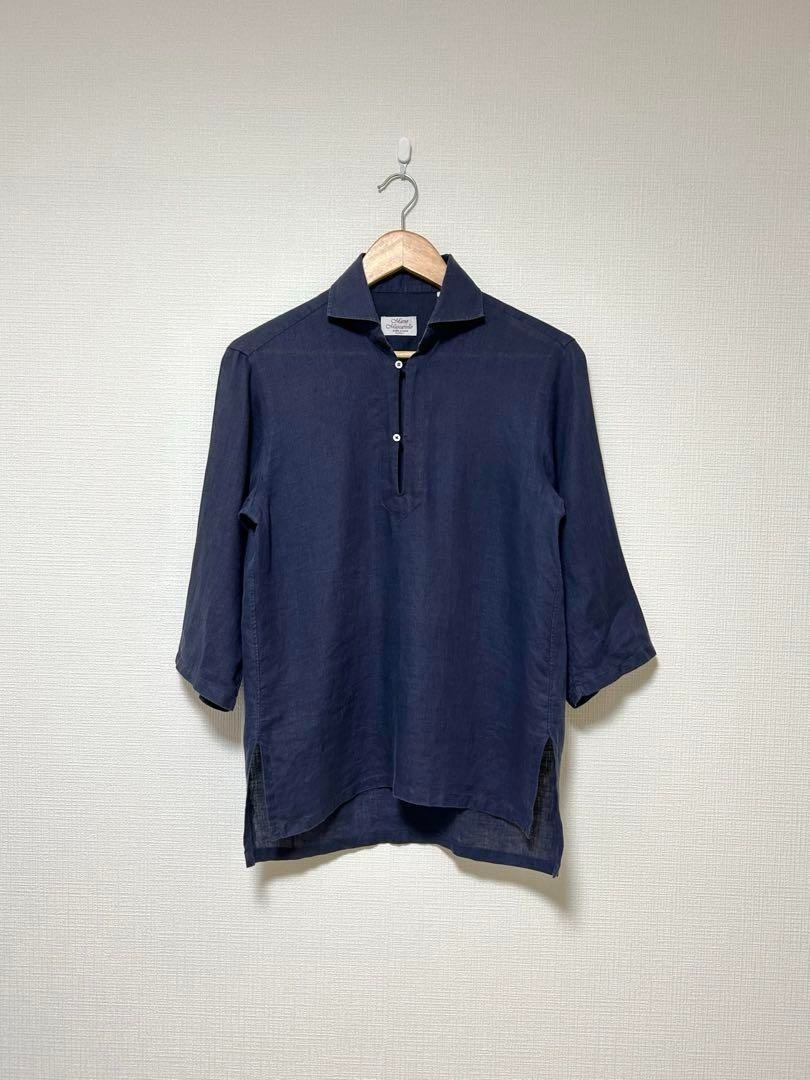 最高級リネン素材のカプリシャツ。袖は七分でボタンはゴムループで留める仕様です。