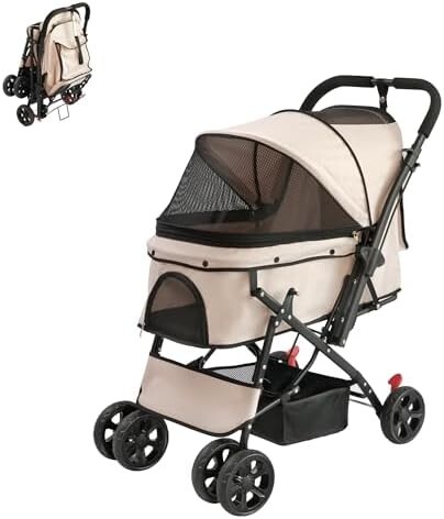 MOTASAN ペットカート 犬カート 対面両用 多頭 折りたたみ 収納 コンパクト 大開口 ストッパー 中型犬 小型犬 猫 2way 軽量 耐荷重25KG (黒いフレーム, ミルクティー 生地)