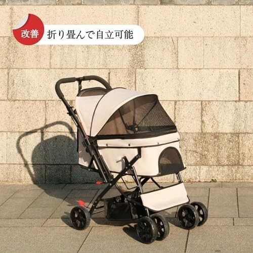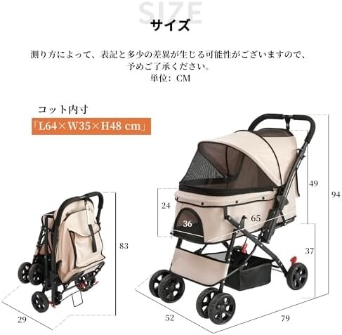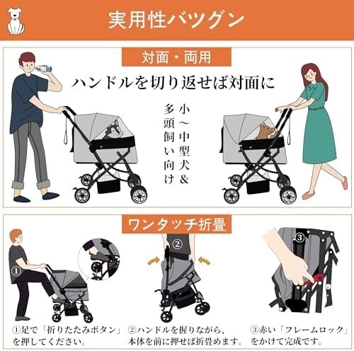 • ?【追い求めたのは「快適さ」】取扱説明書は充実し、2ステップで組立完了!女性でも簡単に組立可能!コットは135度開くオープンエアルーフを採用し、好きな角度でキープできます。開口部が大きく開くので、乗せ降ろしがスムーズに。ペットのケアもしやすくなりました。34.5×64×47CMのコット内寸で、多頭飼いや、より大きな犬種でも快適にお使いいただけるようになりました。コット内にマットが付属し、水や汚れが付いてもサッと拭いて綺麗に掃除ができます。「飛び出し防止リード」を2本装備し、「リストストラップ」はハンドル部分に設置し、前後3箇所にエアスルーウィンドウがあり、機能完備の製品です。