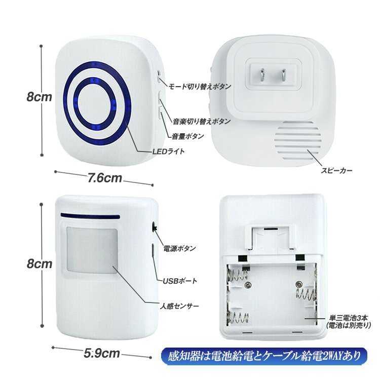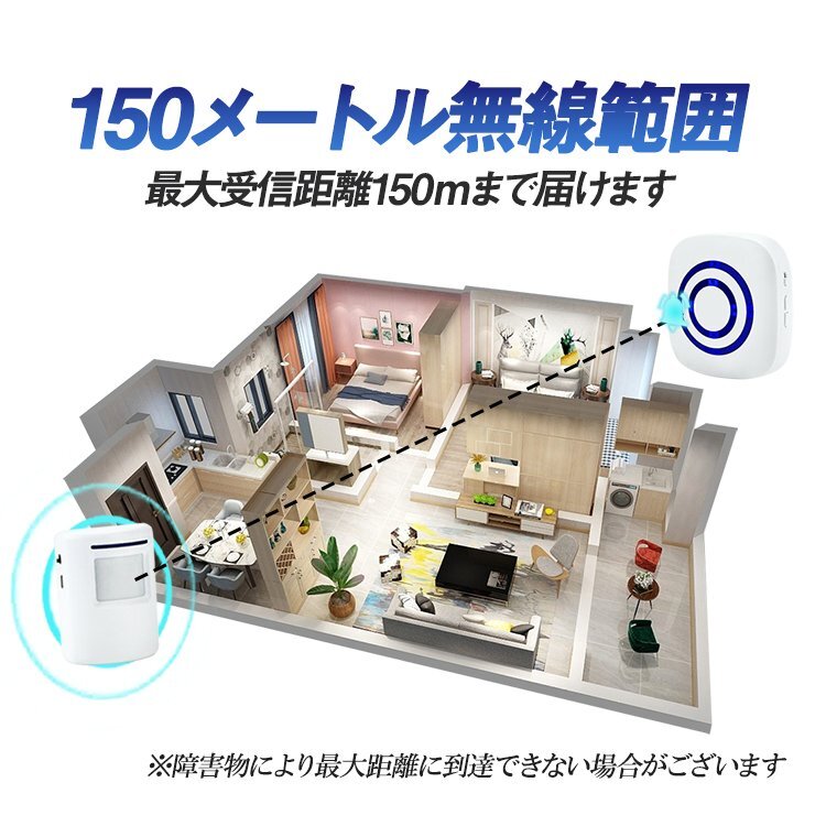 ◆ワイヤレスチャイム 人感センサー 玄関チャイム 無線最大150m 静音モードあり コードレスチャイム ドアチャイム 3段音量調節 メロディ38種類 介護 防犯アラーム YF0256