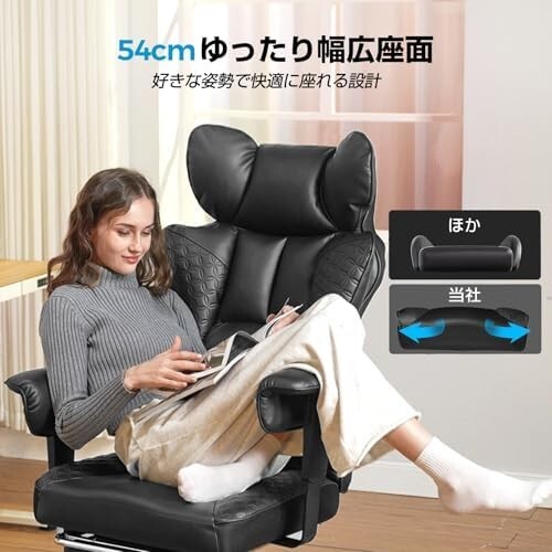 【広めの座面、まるでソファのように】足を組んだり曲げたりしても十分なスペースがあります。程よい硬さのクッションがしっかり支え、まるでソファに座っているかのような快適さを提供します。背もたれも広めで、ゆったりとした座り心地です。