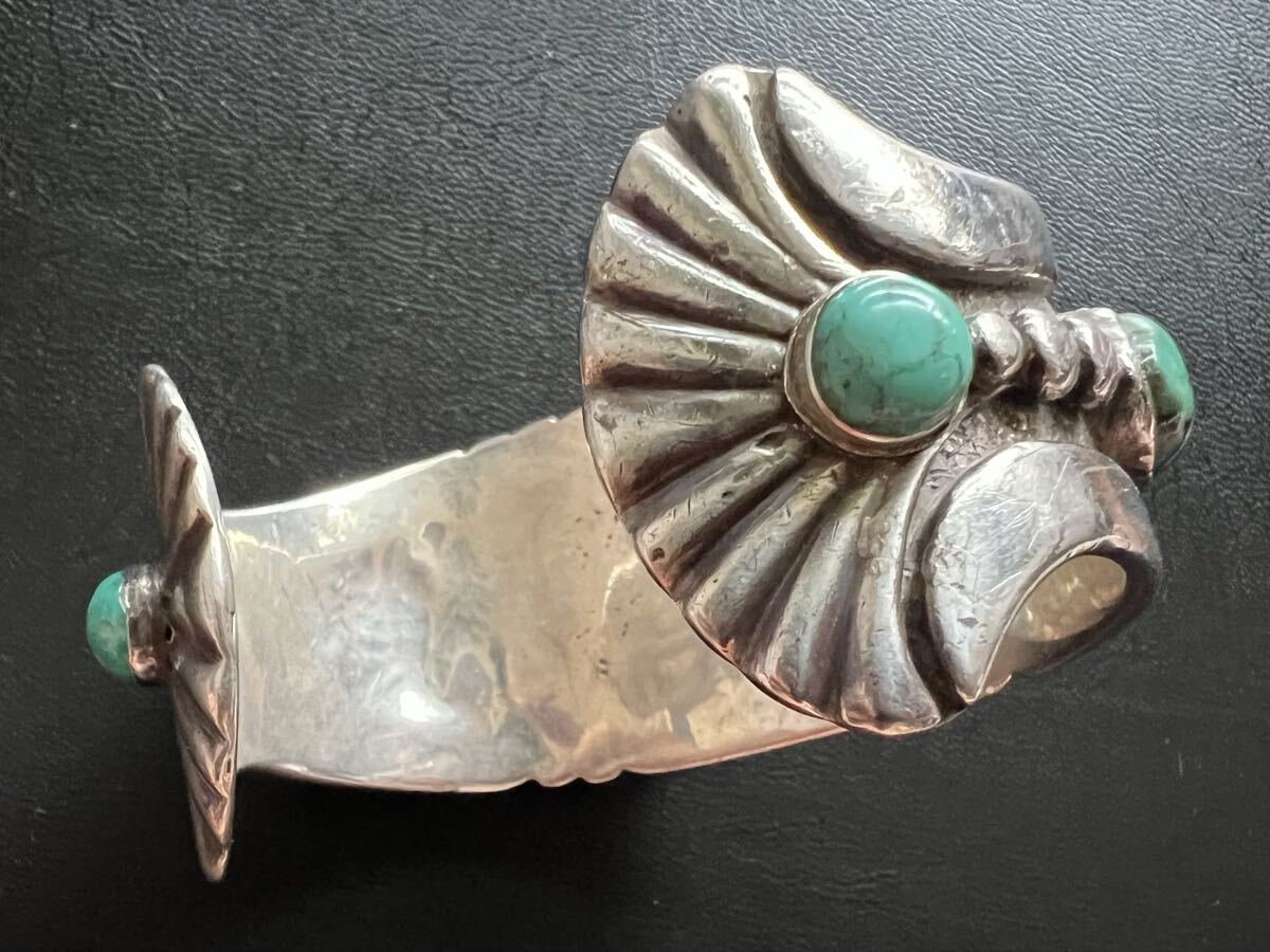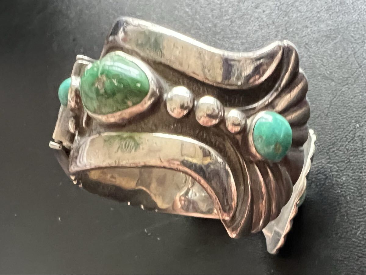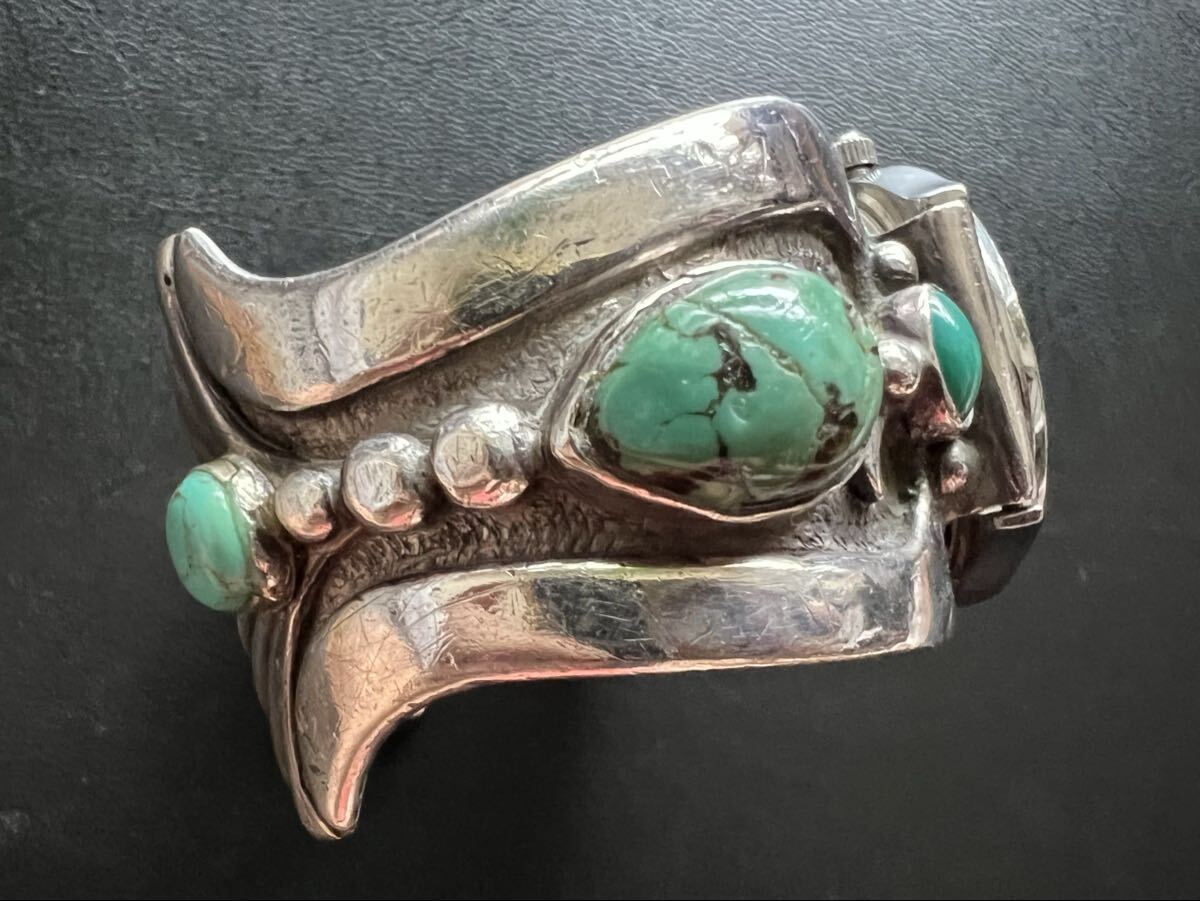 こちらの作品は1960年代に制作されたスペシャルヴィンテージのウォッチ・バングルで、ingotのコインシルバーから叩き出されたケトースタイルの作品はLewis Lomayならではのエレガントな作風で、ドロップやターコイズ、ファイリングによりオーバーレイをさらにゴージャスに彩った存在感のあるマスターピースになります。