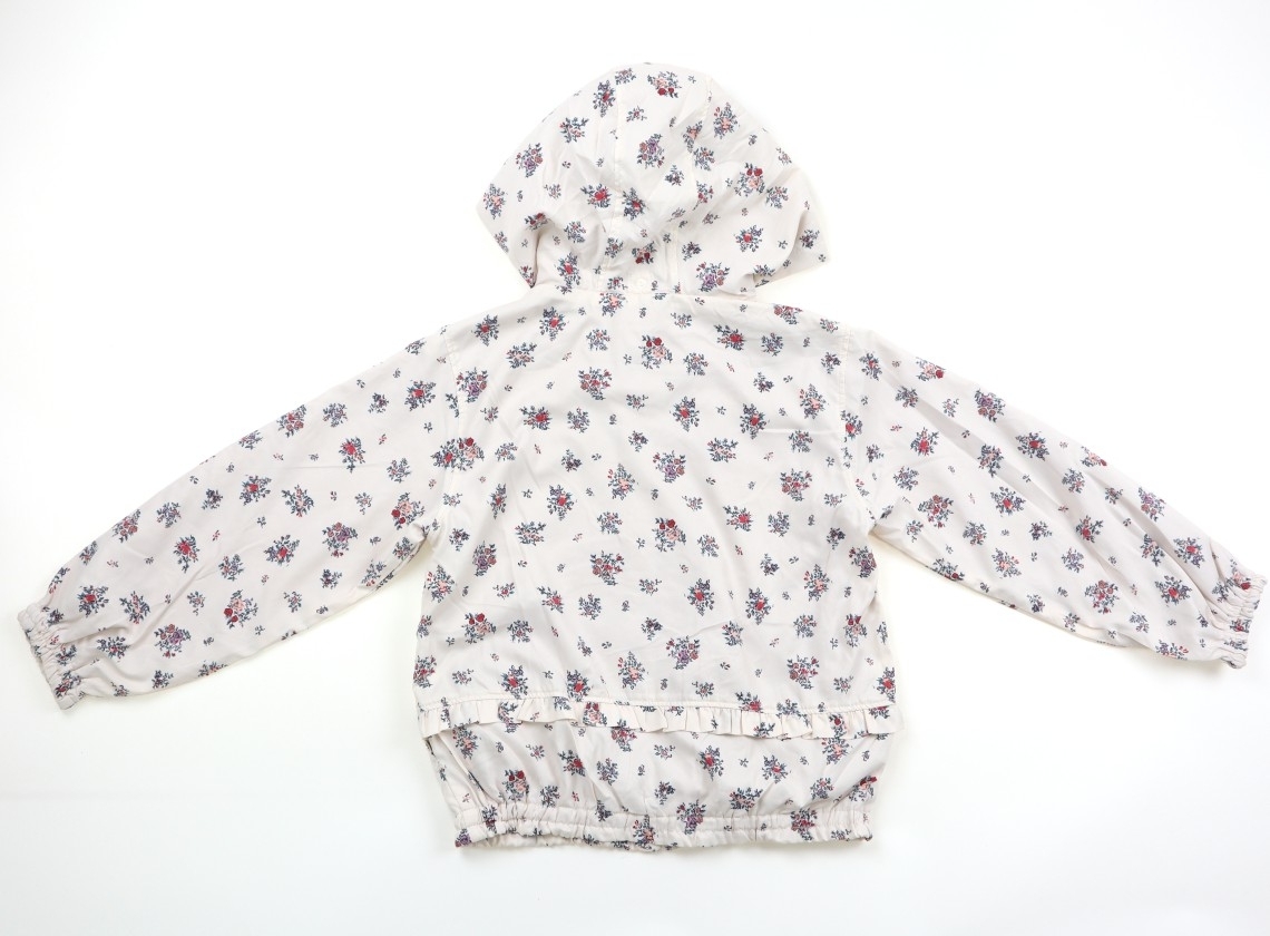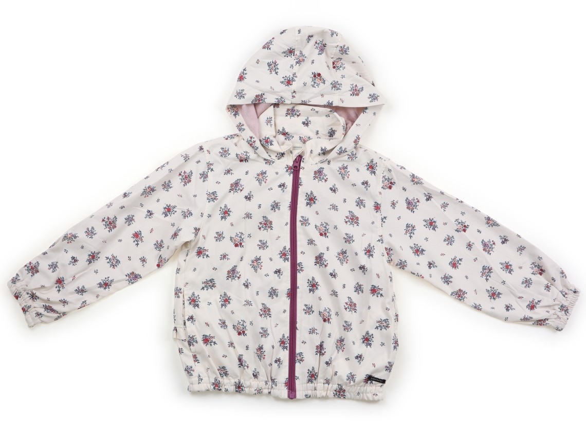ポリエステル素材です。メッシュ生地の裏地がついています。フードは襟の中にしまえます。右袖に引っ掛け傷がありますが、まだまだ普段着として活躍してくれそうです。