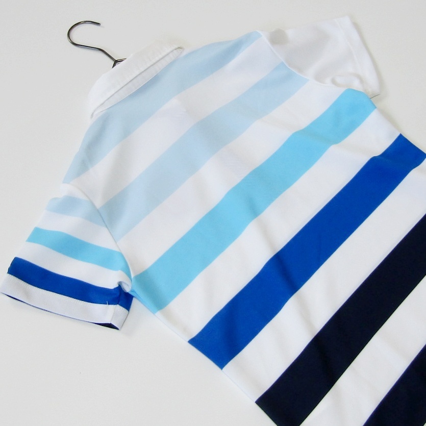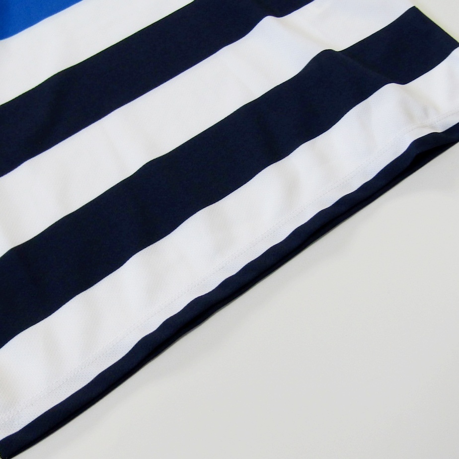 ホワイトをベースにブルーのボーダー柄をあしらった爽やかなデザインで、清潔感とスポーティーさを兼ね備えています。