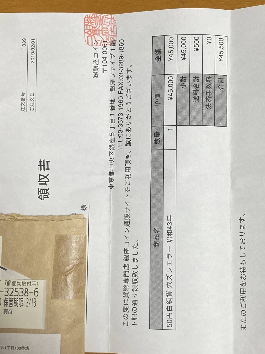 たくさんのアクセス・ウォッチリスト登録ありがとうございます。写真追加しました。43年発行の穴ズレ50円の領収書がありました。56年のこのコインの方がもう少し高かったと記憶しています。価格の参考にして下さい。宜しくお願い致します。