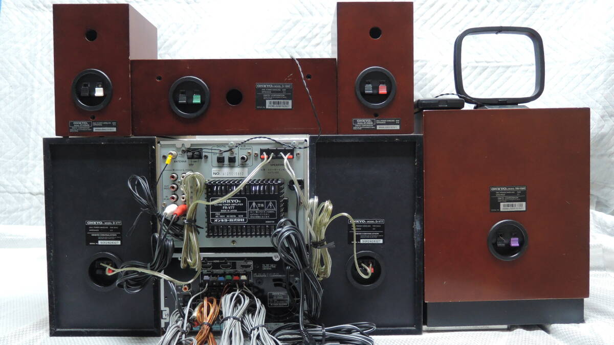 [管理番号:125] ONKYO FR-V77 & D-V77 まとめ売り おまけ BASE-V20HD ホームシアター ・SA-205HD (AVセンター) ・D-108C (センタースピーカー) ・ST-V20HD (サテライトスピーカー) ・SWA-V20HD (サブウーファー) 【外観:程度良】 【状態:ジャンク】 ・FR-V77のCDトレイが出ません。 本体リモコン受光部の横側を叩くと振動でトレイが出てきます。 ・CDの再生確認、CD→MD録音、MD再生確認済みです。 ・おまけとしてホームシアターセットもお付けします。 ただし、リモコンありません。 キズ、凹みあります。 動作も未確認です。 【付属品】 ・リモコン (FR-V77) ・スピーカーコード ・アンテナ 梱包サイズが大きくなるため、二個口での発送となります。 他にも画像が御座いますので宜しければご覧になってください。 ONKYO FR-V77 & D-V77 まとめ売り + おまけ | ||