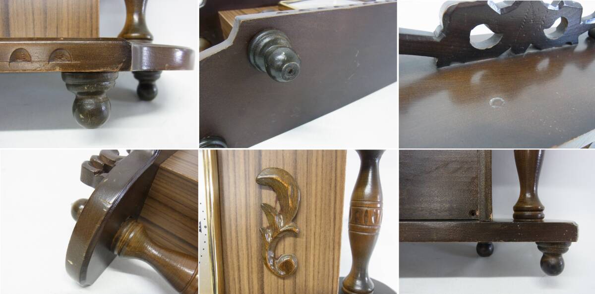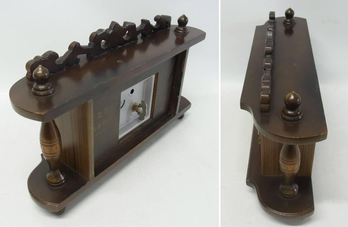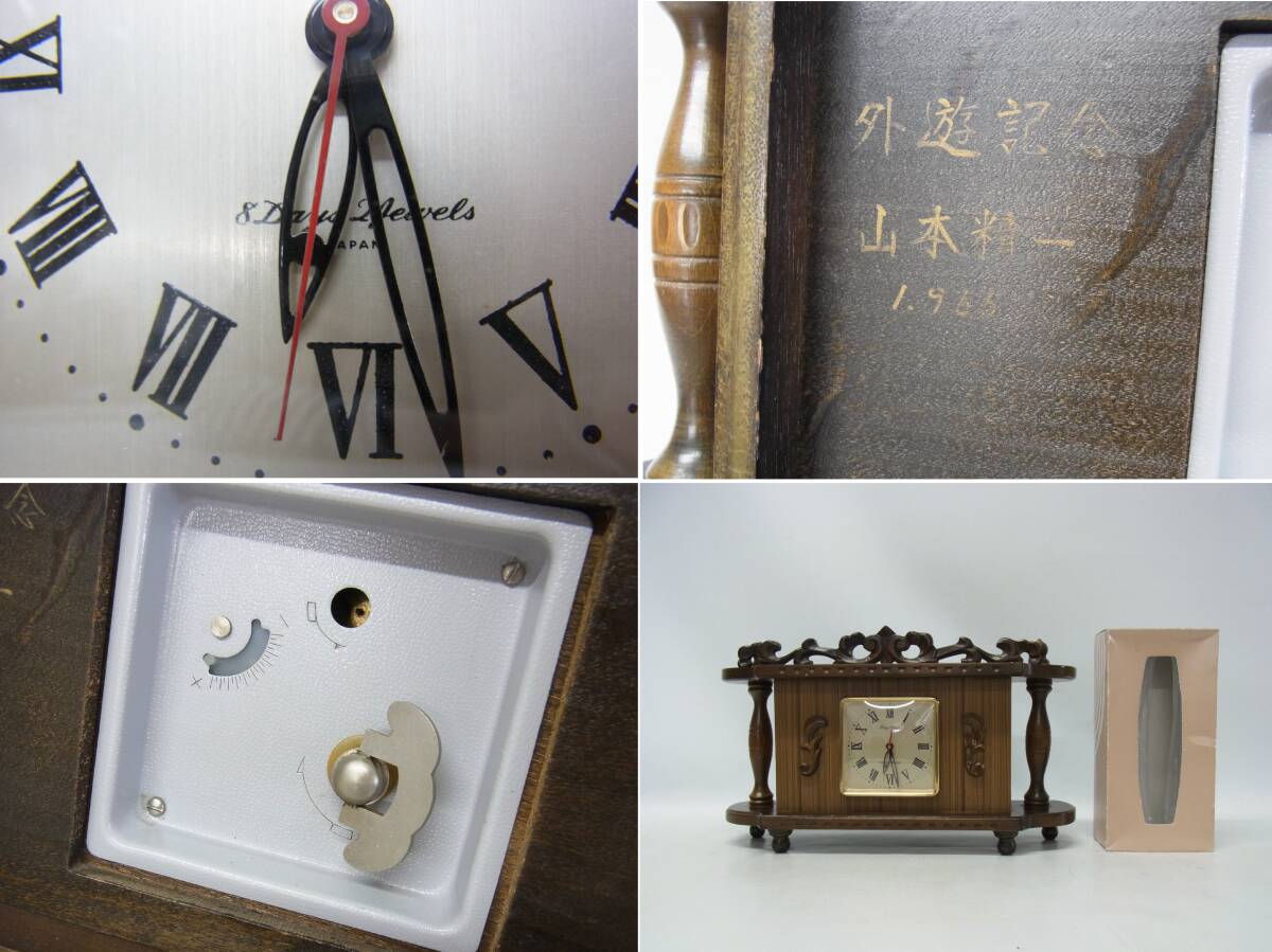 譲り受けた物で、本来の状態含め詳細は不明です。 画像にてお詳しい方、お分かりになる方のご判断でお願い致します。 裏面記念名あります。 時間合わせのツマミが欠損している為、時間合わせは出来ません。 ゼンマイを数回巻きましが、動きませんでした。 スレ・キズやくすみ・変色、汚れや細かな部分に入り込んだ塵・埃など ヴィンテージ感ございます。 現状でのお渡しとなりますので、修理、メンテナンスや部品取りなど前提のうえ、 十分なご検討をお願い致します。 状態に関しましては画像でご確認いただき、ご判断をお願い致します。 気になる点はご入札前にご質問ください。 ※専門的な知識がありませんので、ご質問内容によっては お答え出来ない場合があるかもしれません。予めご了承ください。 ジャンク扱い、古いゼンマイ時計、経年保管品になりますので、 ご理解いただける方のご入札いただけましたら幸いです。 撮影した照明により、色合いが多少違って見えるかもしれませんが、ご了承ください。 【サイズ】 幅約36.5×奥行約10×高さ約22.2センチ ※素人採寸です。多少の誤差はご容赦ください。 ※画像では高さ約22cmのティッシュ箱と比較もしております。 【発送方法】 ・ゆうパック/80サイズ ---------------------------------------------------------------------- ※ゆうパックの送料はお届け地域によって送料が異なりますので、 気にされる方は必ずご入札前に「質問欄」よりお問い合わせください。 | |||