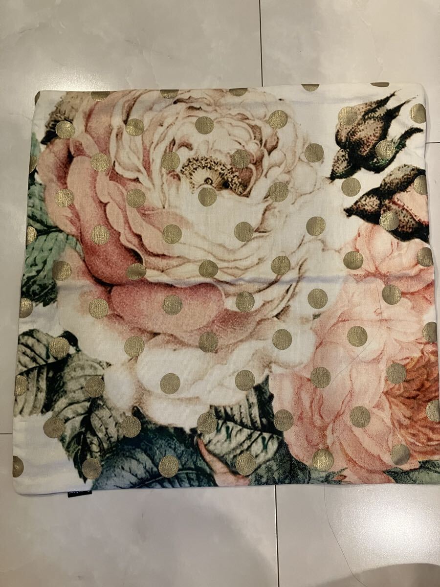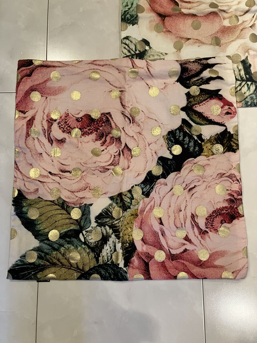 大胆に大きな花をプリントし、その上に箔プリントでドットを施した華やかでモダンなデザインのクッションカバーです。