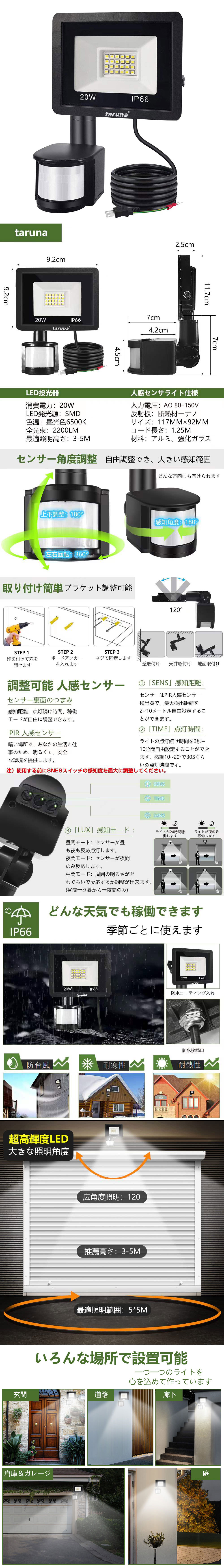 【商品詳細】 ◆センサー調整自由: センサー部は自由自在に調整できます。左右回転:360°、上下調整:180°、検知範囲:180°、感知角度がとても広いです。センサー裏面のつまみで点灯続け時間・検出距離・稼働方式も自由に調整できます。 「TIME」:ライトの点灯続け時間を3秒~10分間自由設定することができます。 「SENS」:センサーはPIR人感センサー検出器で、最大検出距離を2~10メートル自由設定することができます。 「LUX」:昼間モード:センサーが昼も夜も感応点灯します。夜間モード:センサーが夜間のみ反応します。 ◆IP66防水・省エネ: IP66防水防塵仕様で、悪天候でも耐えるように設計されて、屋根のない場所、外からの雨にさらされるような場所に設置しても安心です。高照度のランプビードが搭載されました。他のライトに比べ、同じ電源での条件下では、明るさがアップグレードし、省エネルギー効率が高くなりました。 ◆薄型で便利: 軽薄化で、コンパクトのランプなので、スペースを節約することができ、玄関、廊下、屋内、庭、倉庫、ガレンジ、家庭菜園、歩道など様々なシーンで非常に役に立ちます。そして、ライトは手間が掛かかなく、ネジで簡単に取り付けできます。 ◆長い寿命・満足保証: お客様を満足させるのはいつも私どもの主な目標です。購入日から12か月以内に故障があった場合、返品/交換は無料で行われます。製品についての質問があれば、或は故障や不具合が発生しましたら、私どもにご連絡ください、そして、こちらはすぐに応じます。 【保証】 ◆当商品は12っヶ月保証となります。 ◆お届けから1週間以内にご連絡のあった不良品の保証対応の送料は当方が負担いたします。 ◆保証期間内の不良品ですが、交換のみ対応しております。往復送料はお客様負担となります。在庫がない時だけ返金しますので、ご了承ください。 |