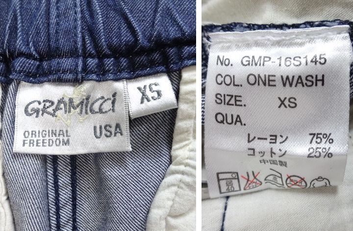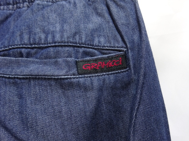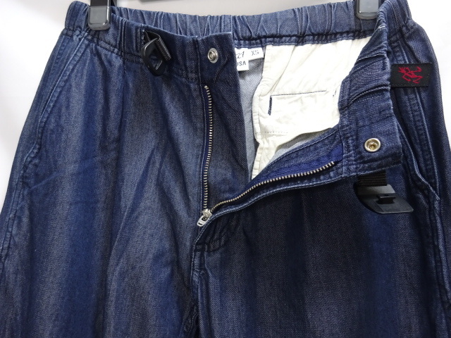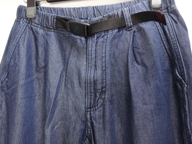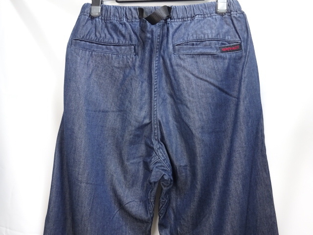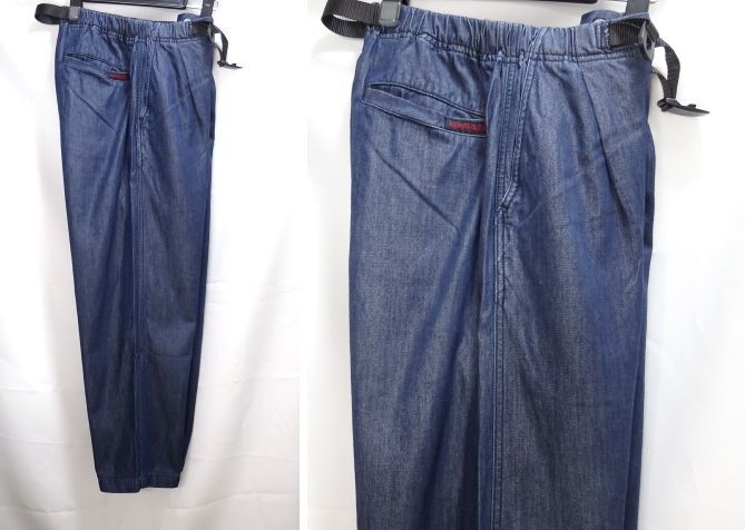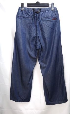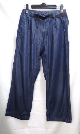 GRAMICCI レーヨン混紡素材、テロっとした柔らかい風合いのライトデニム生地です。 アンクル丈のキレイなシルエットです。 ウエストはナイロンベルトでサイズ調節出来ます。 |