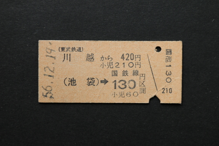 東武鉄道 乗車券 川越から 420円 池袋→130円区間