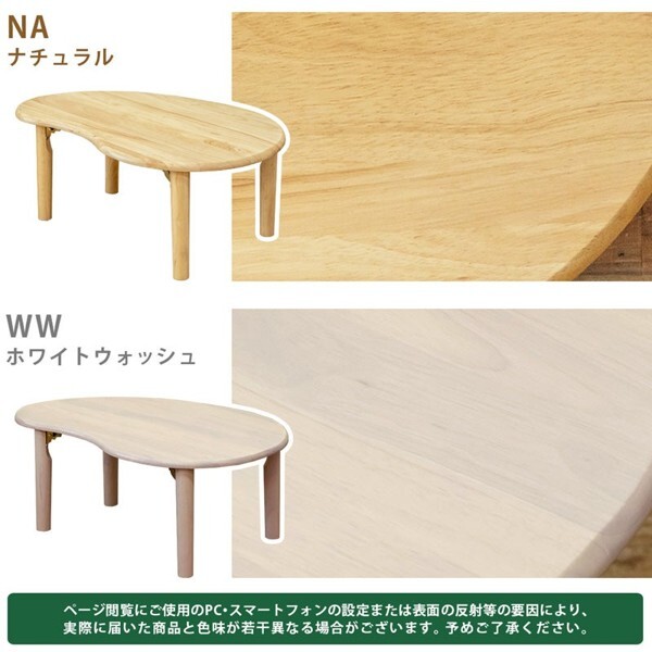 ※現在ご覧の商品ページはナチュラルのご購入ページとなります。 ヤフオクの仕様上単一ページに複数バリエーションを掲載することができませんので、他バリエーションが希望の場合は別ページでご購入お願い致します。 配達業者を指定いただくことはできません。 沖縄県・離島配送不可となります。 天然木ビーンズテーブルです 豆みたいな形をした可愛い天板です 脚は折りたたみ出来ます ナチュラル(NA)、ホワイトウォッシュ(WW)の2色展開です(木目は全て異なります) タイミングによっては在庫切れの場合があります。