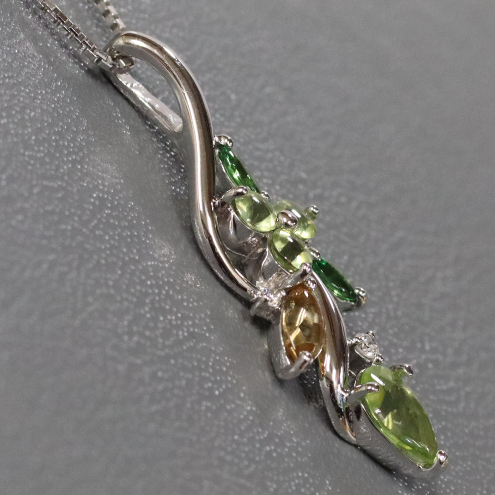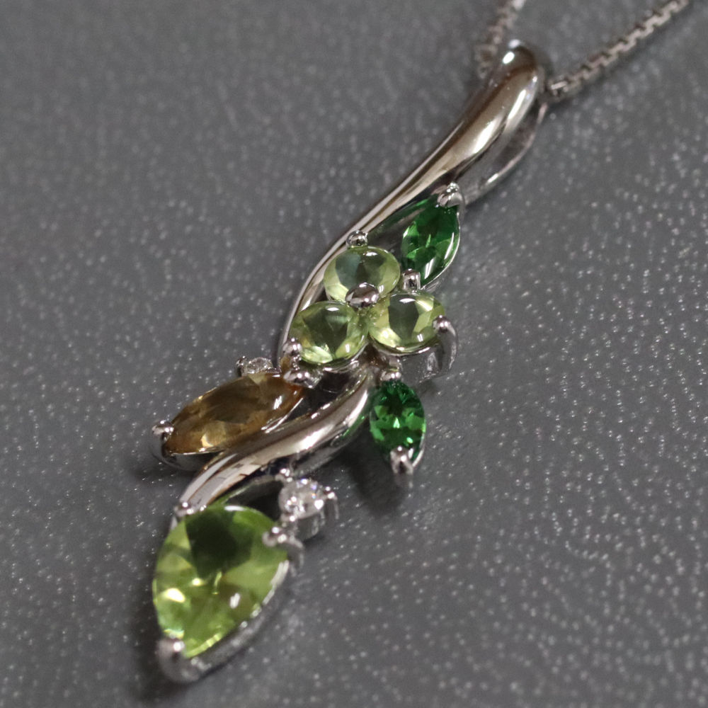 K18WGマルチカラーストーンペンダントの中古品です。 グリーングロッシュラーガーネット、シトリン、ペリドット、ダイヤモンドがセットされた可愛らしいデザインです。 ソーティングが付属します。 肉眼では気になりませんが、石に傷があります。 地金に小傷があります。