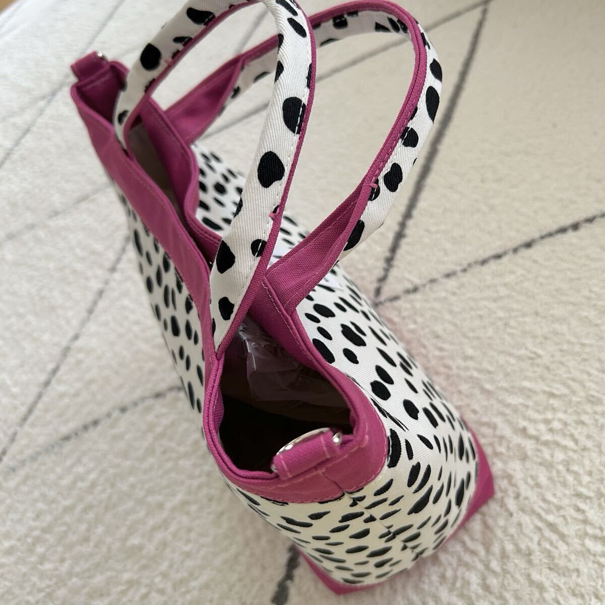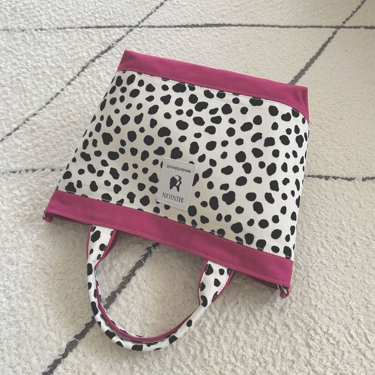 ダルメシアン柄にピンクの帆布を合わせたミニトートバックです。