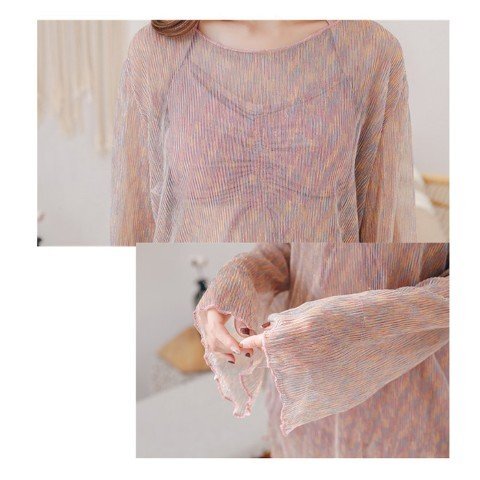 ・程よい透け感のあるシアー長袖トップスは気になるお腹まわりやヒップをカバーしてくれます。