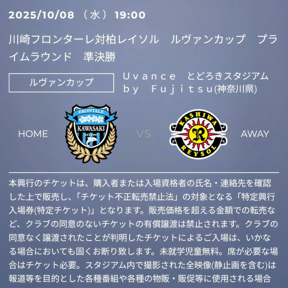 【1枚】10/8 川崎フロンターレ vs 柏レイソル ホームA自由席 大人 1枚 ルヴァンカップ プライムラウンド 準決勝 招待 QR Jリーグ 10月8日