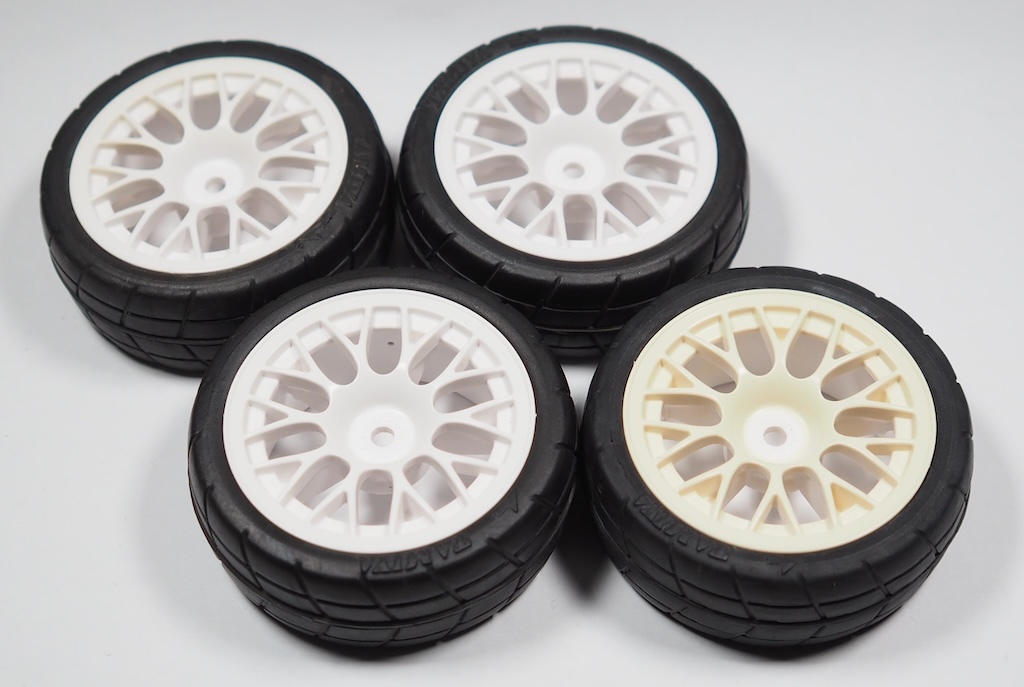 【ゆうパケット3cm/同梱不可】100円〜/処分品 使用少 タミヤ Mナローレーシングラジアル&メッシュスポークホイール4本