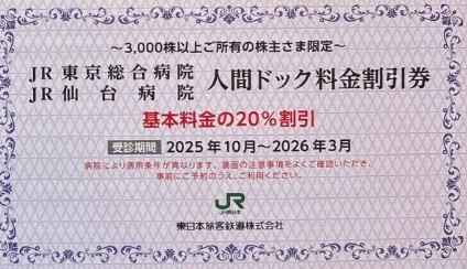 JR東京総合病院とJR仙台病院で使用できる人間ドック料金割引券が1枚です。