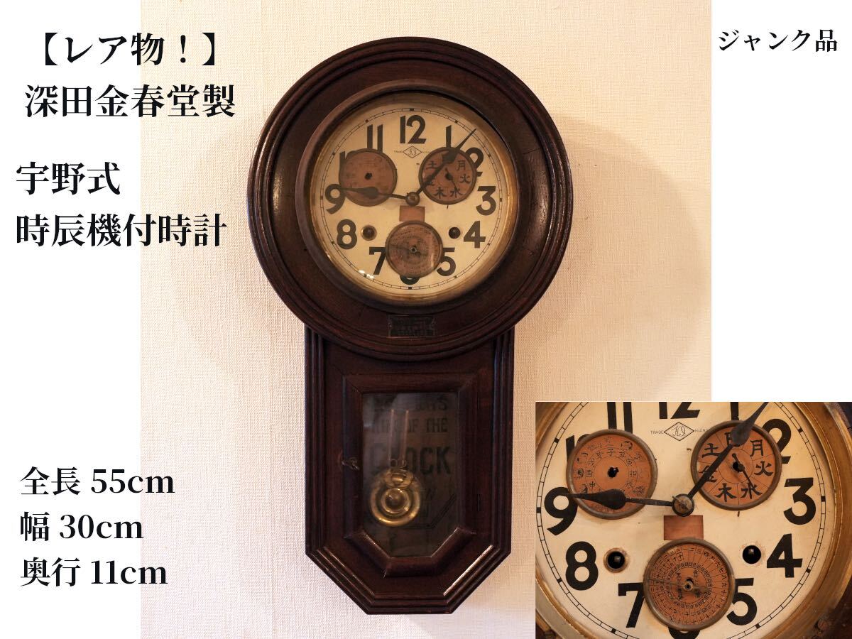 H371 昭和レトロ 壁掛時計 振子時計 ジャンク品 宇野式時辰機付時計 深田金春堂製 全長55cm ゼンマイ式 干支 カレンダー 曜日 未稼働確認済