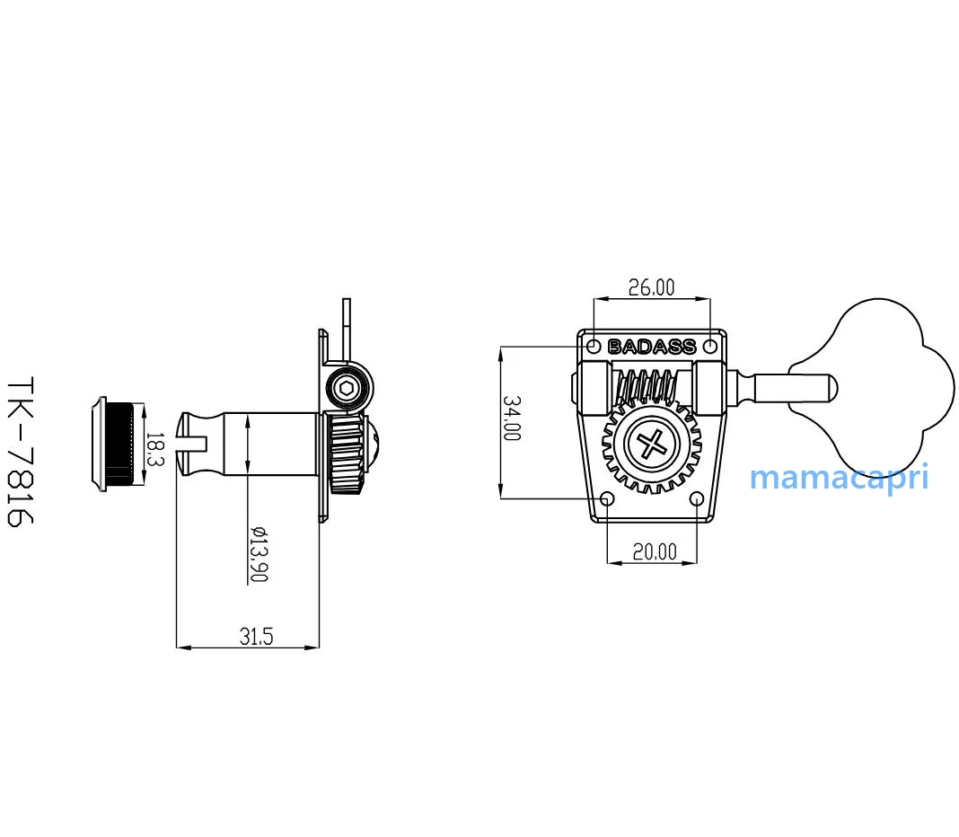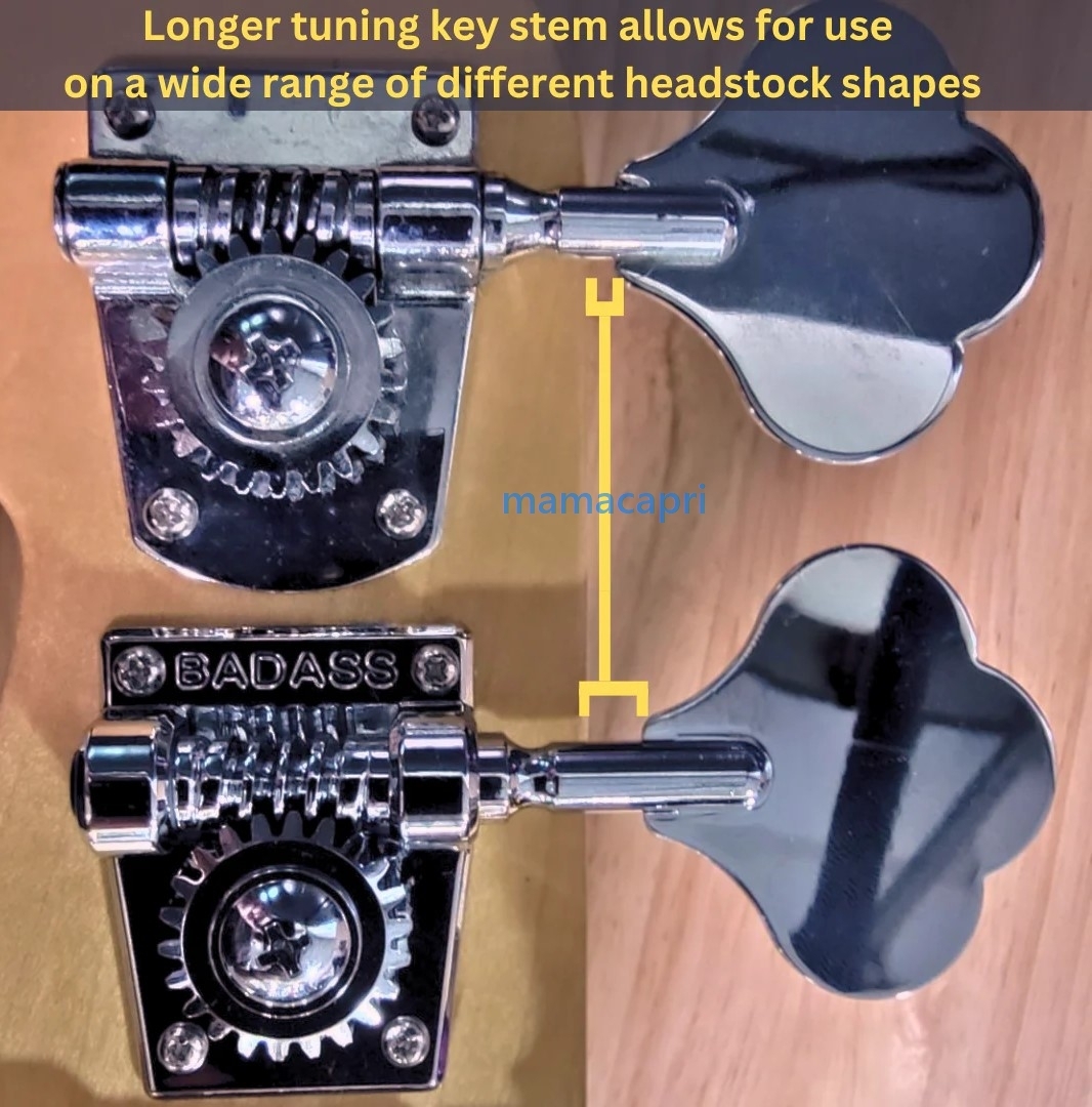 Product description BIRTH OF A BADASS Back in 1972, musician, innovator, and luthier Glen Quan saw the need for higher-quality guitar and bass bridges. With help from Leo Malliari of Leo’s Music in Oakland, CA, the first “Badass” bridges were born. “Leo Quan Badass” bridges were manufactured from a high-density Zinc alloy and offered improved attack, sustain and note-clarity. Badass bridges quickly gained a following with artists looking to upgrade their Fender basses and were ultimately featured on several Fender artist signature models. Through the ‘80’s, BC Rich, Spector and Kramer featured Badass bridges as original equipment on their instruments and artist acceptance continued to grow. Today, Badass is known worldwide as the standard for quality replacement hardware that will enhance the tone, playability and appearance of your guitar or bass. BADASS OGT OPEN GEAR 4-IN-LINE BASS TUNERS Designed as direct replacements for Squier and Fender basses, our Badass OGT’s offer several significant improvements over the originals without straying too far from their classic look. Utilizing a cast base plate rather than the traditional stamped-design improves stability and surface contact with the back of the headstock while a hex-head worm-gear tension screw reduces slip, ensures a smooth feel, and improves tuning accuracy. Last but not least, we lengthened the tuning key stem just a smidge for better clearance around the headstock. After all, why settle for average when you can be Badass? Features: High-tolerance 22:1 gear ratio for maximum accuracy and minimal slippage. Cast Zinc base plate for improved stability and improved contact with the back of the headstock. Hex-head worm-gear tension screw reduces slip, ensures a smooth feel and improves tuning accuracy. Lengthened tuning key stem and two post sizes accommodates a wide range of Squier and Fender models. Large Post 14mm zinc post, bushing requires 18mm headstock hole (18.4mm OD) Small Post Version- See TK-7817 Classic aesthetic preserves the look of your favorite bass. 4 screw parallelogram mounting screw pattern (drilling new holes may be required). |