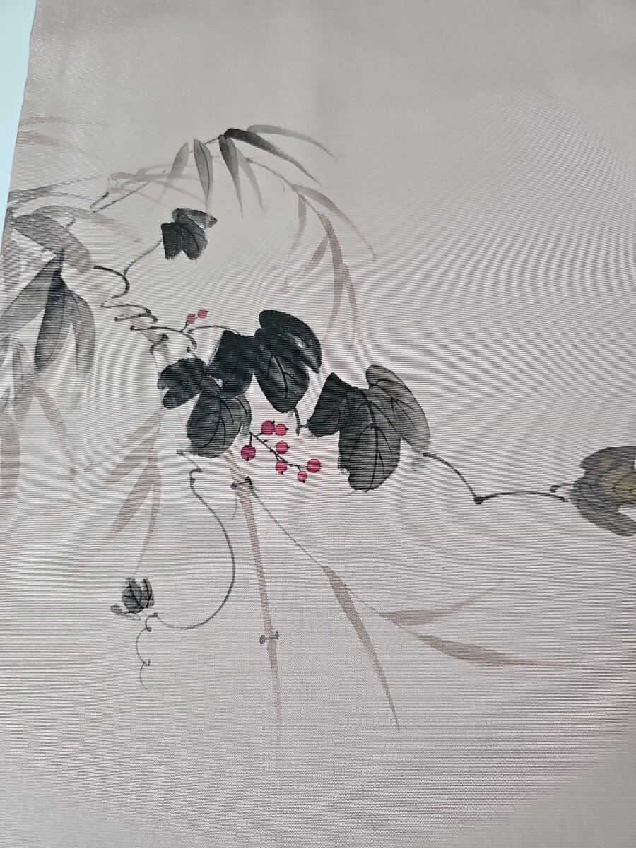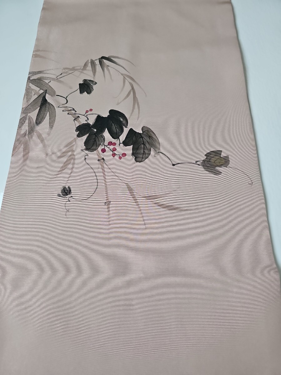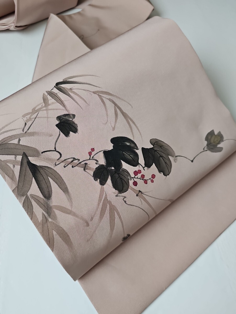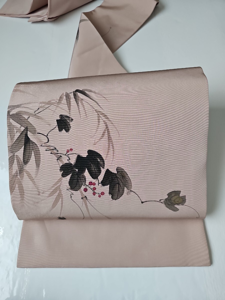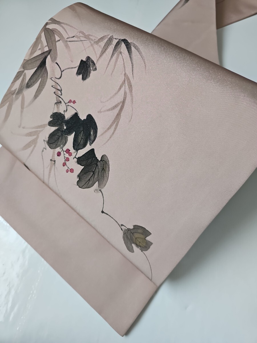 ★滑らかで良い塩梅の張りを有する塩瀬織、梅鼠と薄柿色系を合わせた様なシックな色味、前柄と太鼓に繊細なタッチの染文様を配した上等なお品ものでございます。