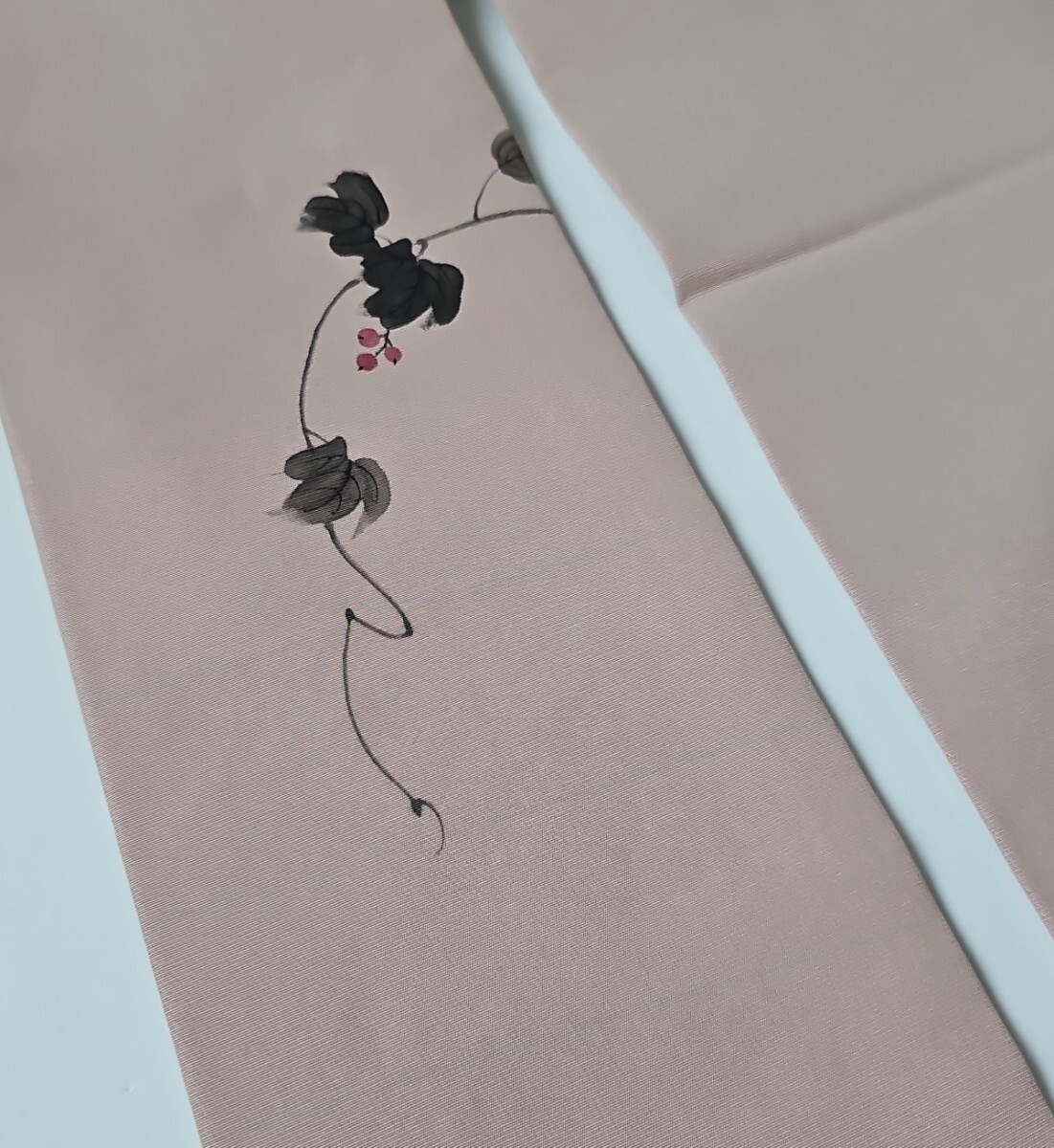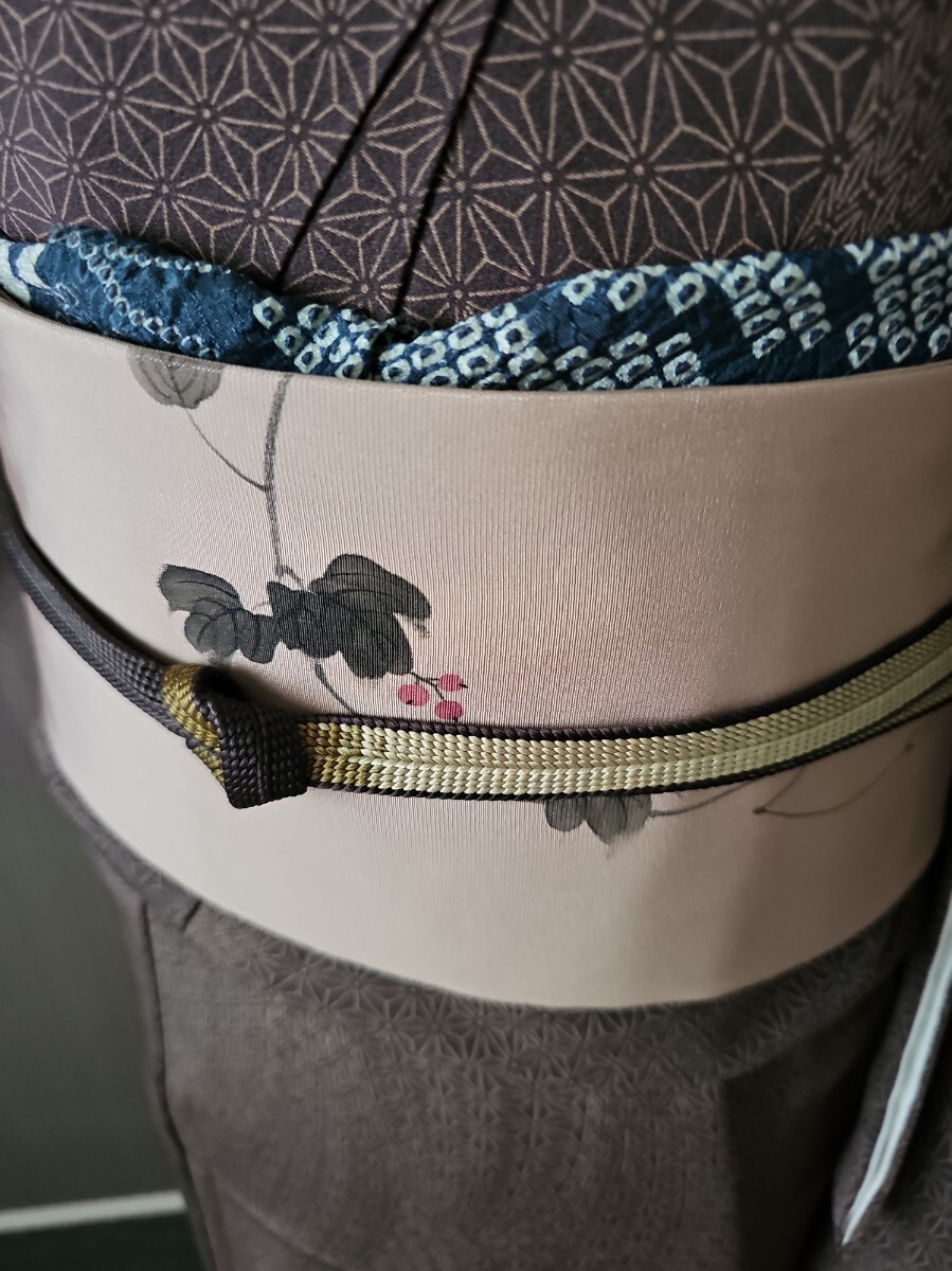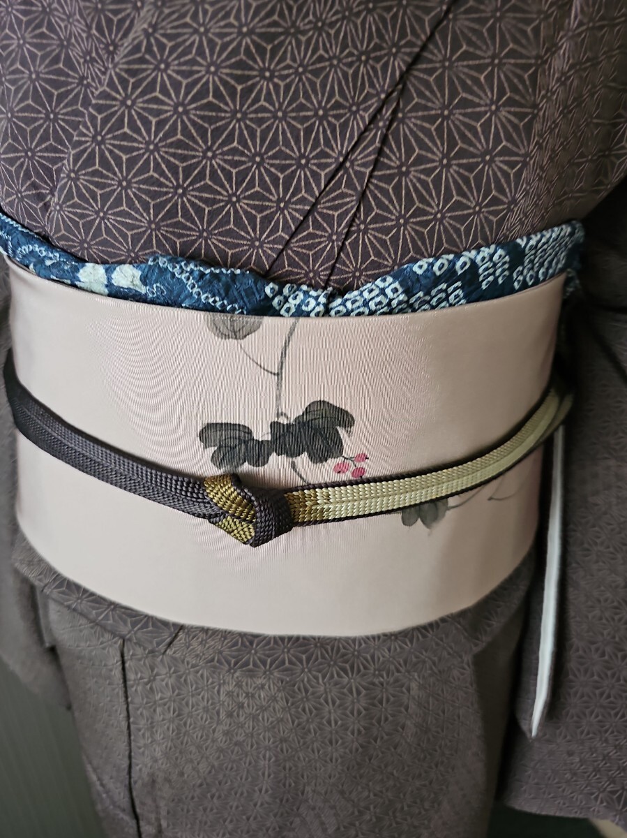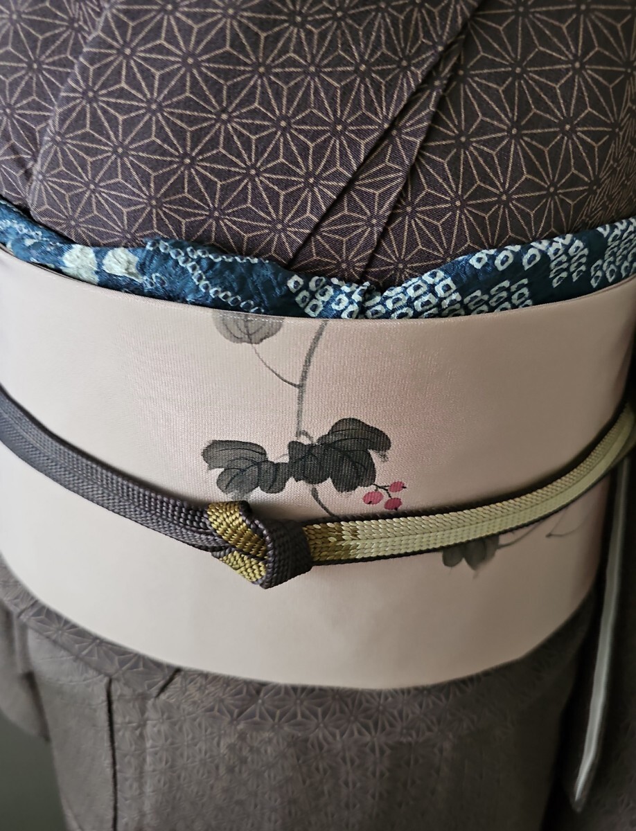 ★滑らかで良い塩梅の張りを有する塩瀬織、梅鼠と薄柿色系を合わせた様なシックな色味、前柄と太鼓に繊細なタッチの染文様を配した上等なお品ものでございます。