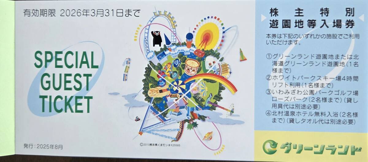 グリーンランド株主優待券2枚です。(遊園地等入場券2枚+ホテル飲食優待10%割引2枚)