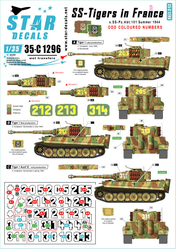 スターデカール 35-C1296 1/35 フランスのSS-タイガー # 5. 奇数色の砲塔番号. 1944年夏のSS第101重戦車大隊