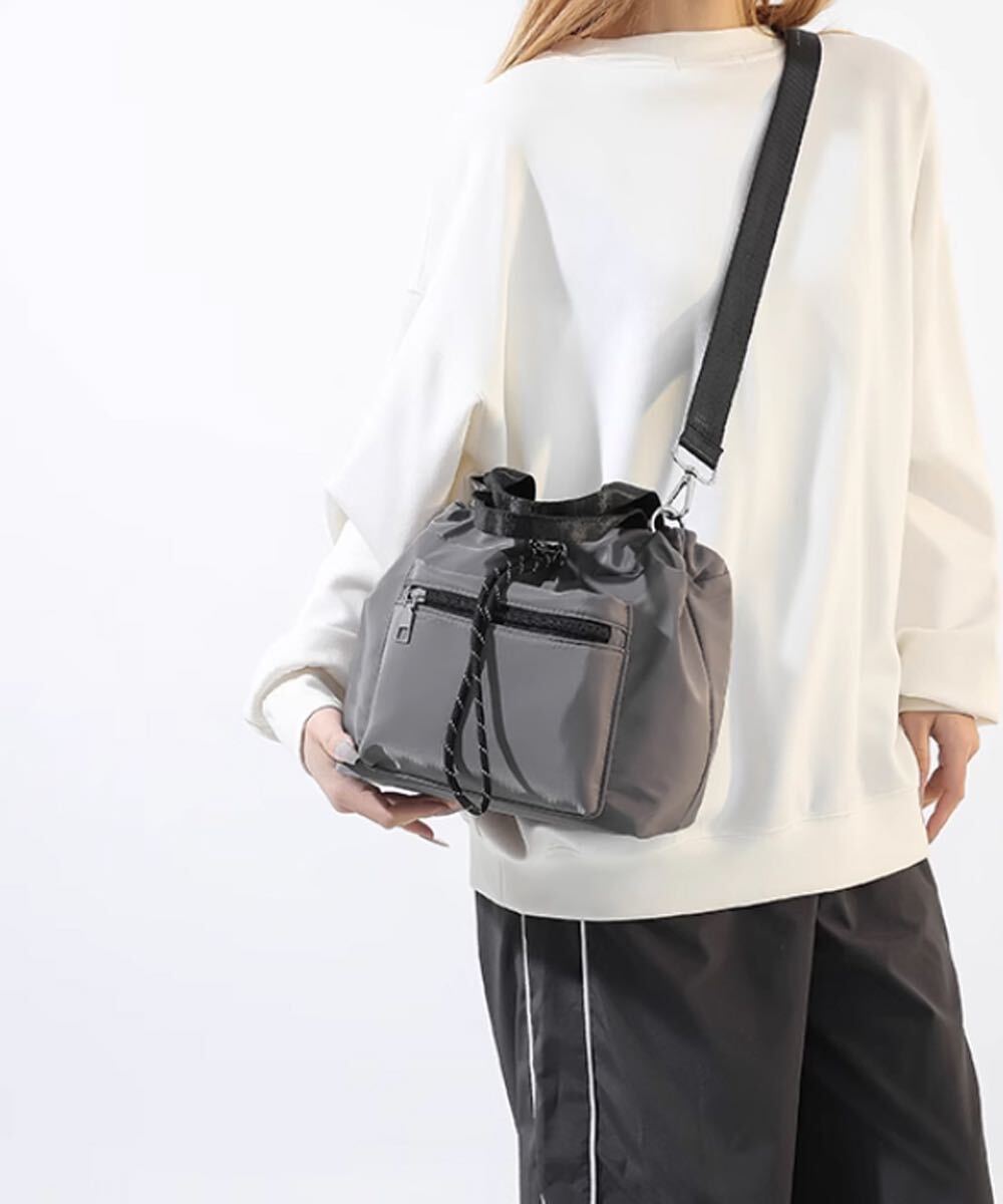 ショルダーバッグ 巾着トート 2way 肩掛け ナイロン ポシェット ハンドバッグ グレー