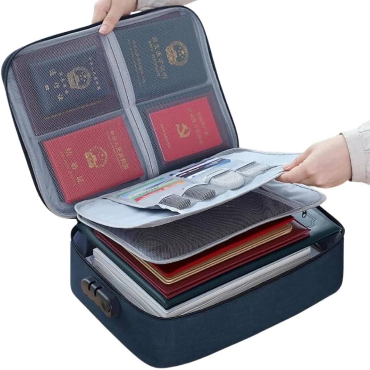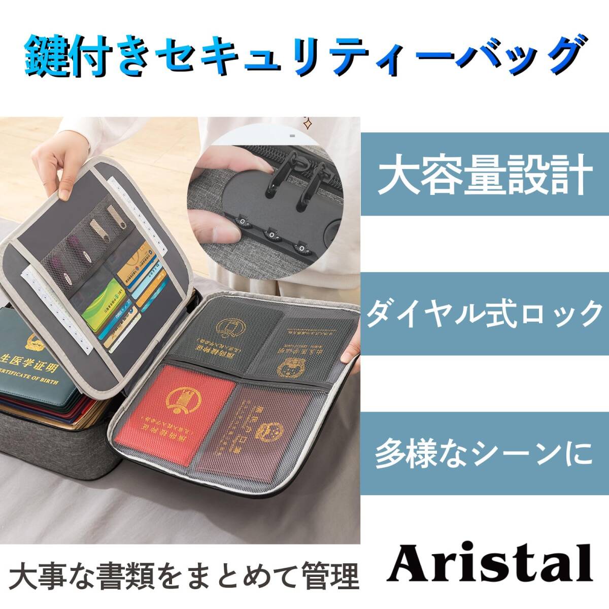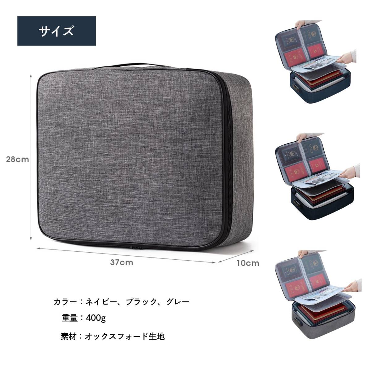 【大容量設計で書類や貴重品を一括収納】 A4サイズの書類やタブレット、カード、パスポートなど、さまざまなアイテムをまとめて収納できる大容量設計。オフィスや家庭での整理整頓が簡単にできます。 【3連ダイヤル式ロックで高いセキュリティ】 鍵不要の3連ダイヤル式ロックを搭載し、貴重品をしっかりと保護。鍵の紛失を心配する必要がなく、安心して使用できます。 【耐久性のある600Dオックスフォード生地】 丈夫な600Dオックスフォード生地を採用しており、耐摩耗性と防水性に優れた構造。長期間使用しても形崩れせず、外出や出張でも安心です。 【軽量で持ち運びやすい設計】 重量約400gと軽量で、取っ手付きのデザインにより移動時も便利。旅行や外出時にも快適に持ち運べます。 【多用途でさまざまなシーンに対応】 書類の保管、旅行時の貴重品管理、オフィスでのデスク周り整理など、多目的に活用可能。一つで幅広いニーズに応えます。