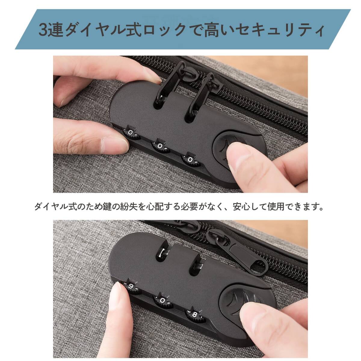 【3連ダイヤル式ロックで高いセキュリティ】鍵不要の3連ダイヤル式ロックを搭載し、貴重品をしっかりと保護。鍵の紛失を心配する必要がなく、安心して使用できます。