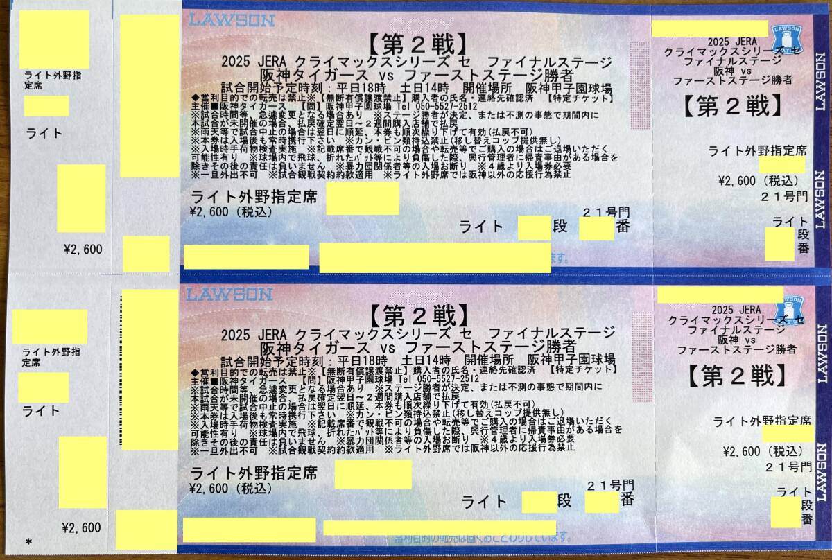 クライマックスシリーズ CS ファイナル 第2戦 阪神タイガースvsファーストステージ勝者 甲子園球場 ライト外野指定席 7段~17段 2枚連番