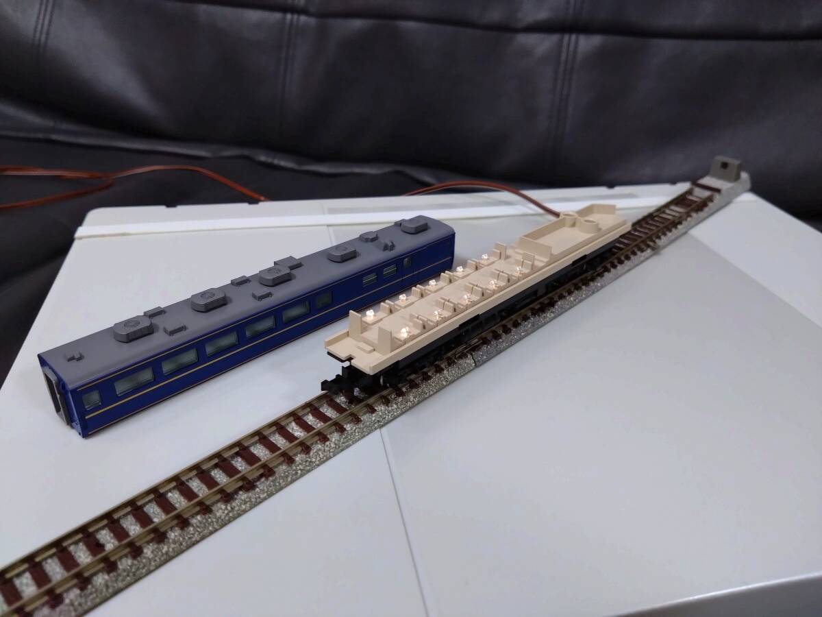 ・オハネフ25 200:「テールライトのON-OFFスイッチ(シャッター機能・遮光機能)」有りの下回り、車掌室側はTNカプラー JC6387を装着、車掌室側車端部窓ガラスパーツは、テールマーク部に「北斗星」印刷済み、AU77クーラーは更新型を搭載、もちろんテールライト点灯します。