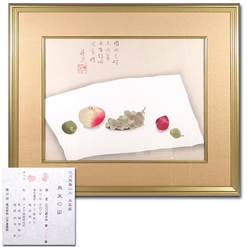 慶應◆豪華図録掲載同手!【北大路魯山人】限定制作木版画 果実図 額装 アダチ版画研究所制作 北大路和子、福田房子認定証明シール タトウ