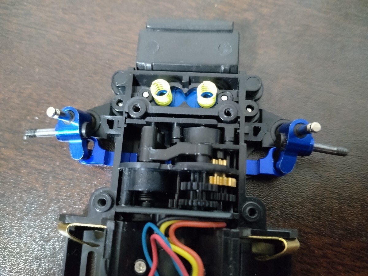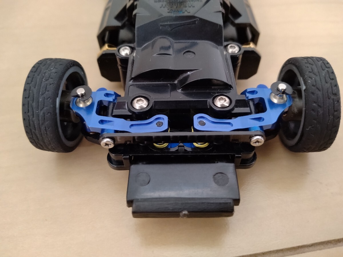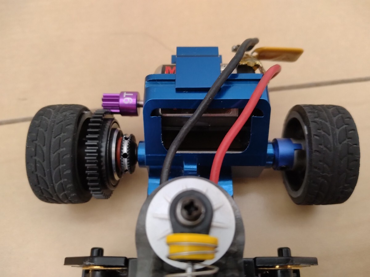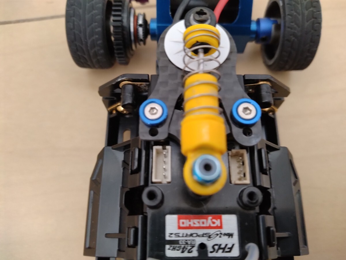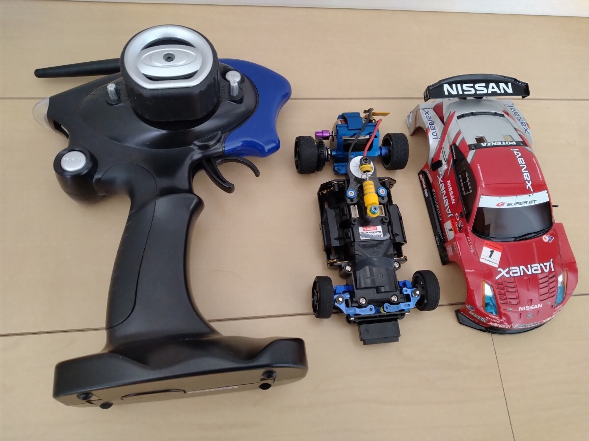 金端子メインシャシー、アルミフロントアッパーアーム、アルミステアリングブロック、メタルサーボギア、オイルダンパー、RMロールダンパー、カーボンリアサスプレート、アルミモーターマウント、ボールデフⅡ、アルミピニオンギア、フルベアリング、XSPEEDVモーター、など