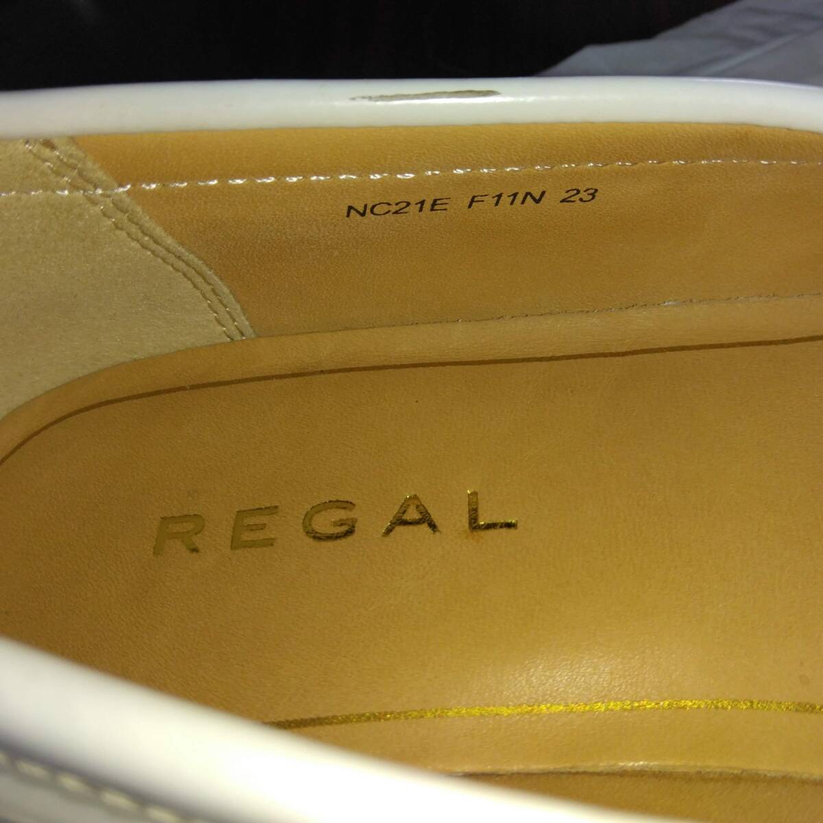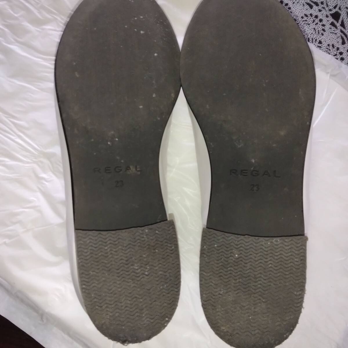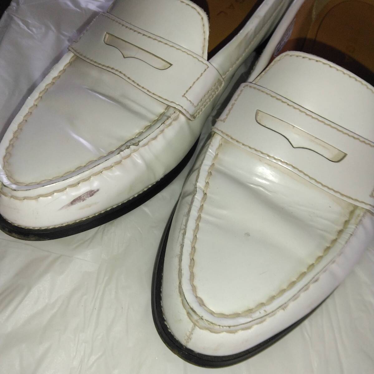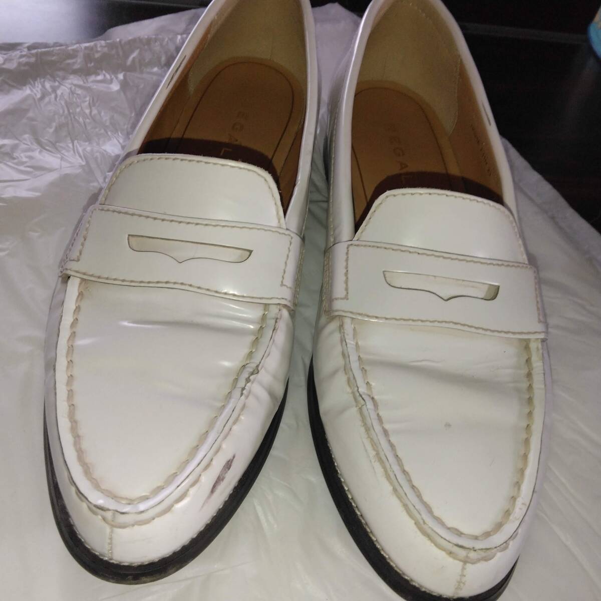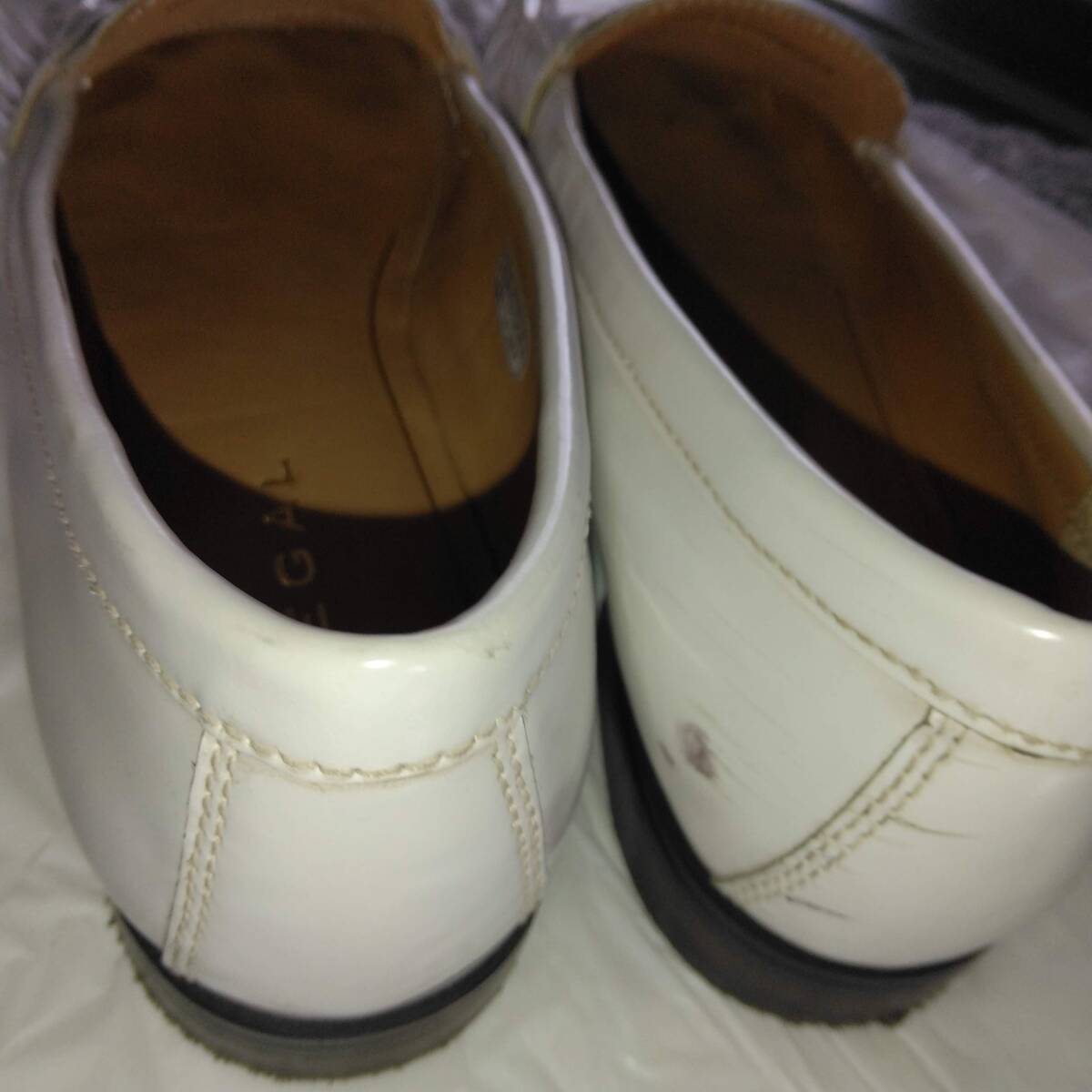 数回履きましたので、右内側にかかとのスレが2箇所ありますがそれ以外は難なく美品の範囲で綺麗な状態です。上質の靴、ホワイトカラーのリーガル・コインローファー、柔らかなインソールで履きやすいです。