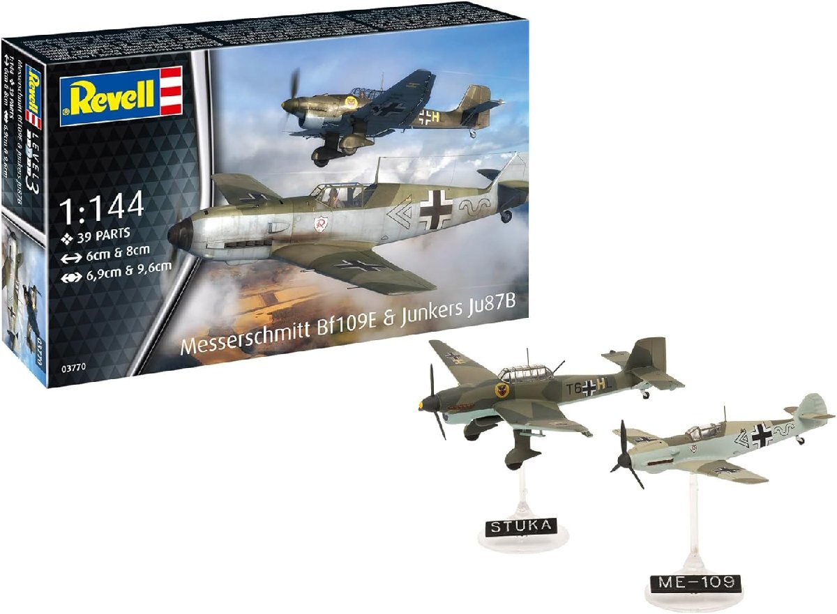 ドイツレベル 03770 1/144 メッサーシュミット Bf109E & ユンカース Ju87B スツーカ (組み立てキット) 定価¥2500(税別) この商品はネットショップでも併売しているため、完売した場合は納品できない場合があります。