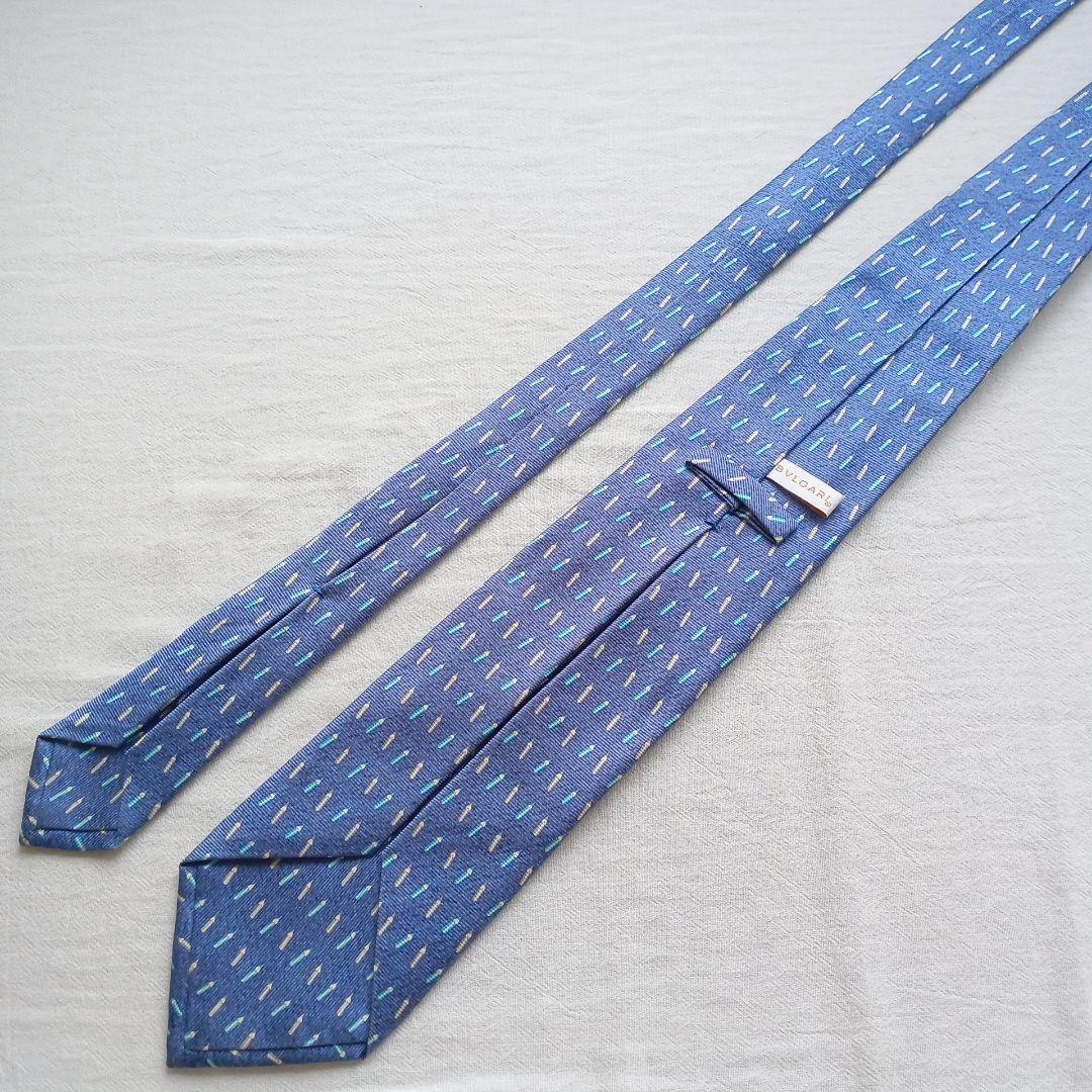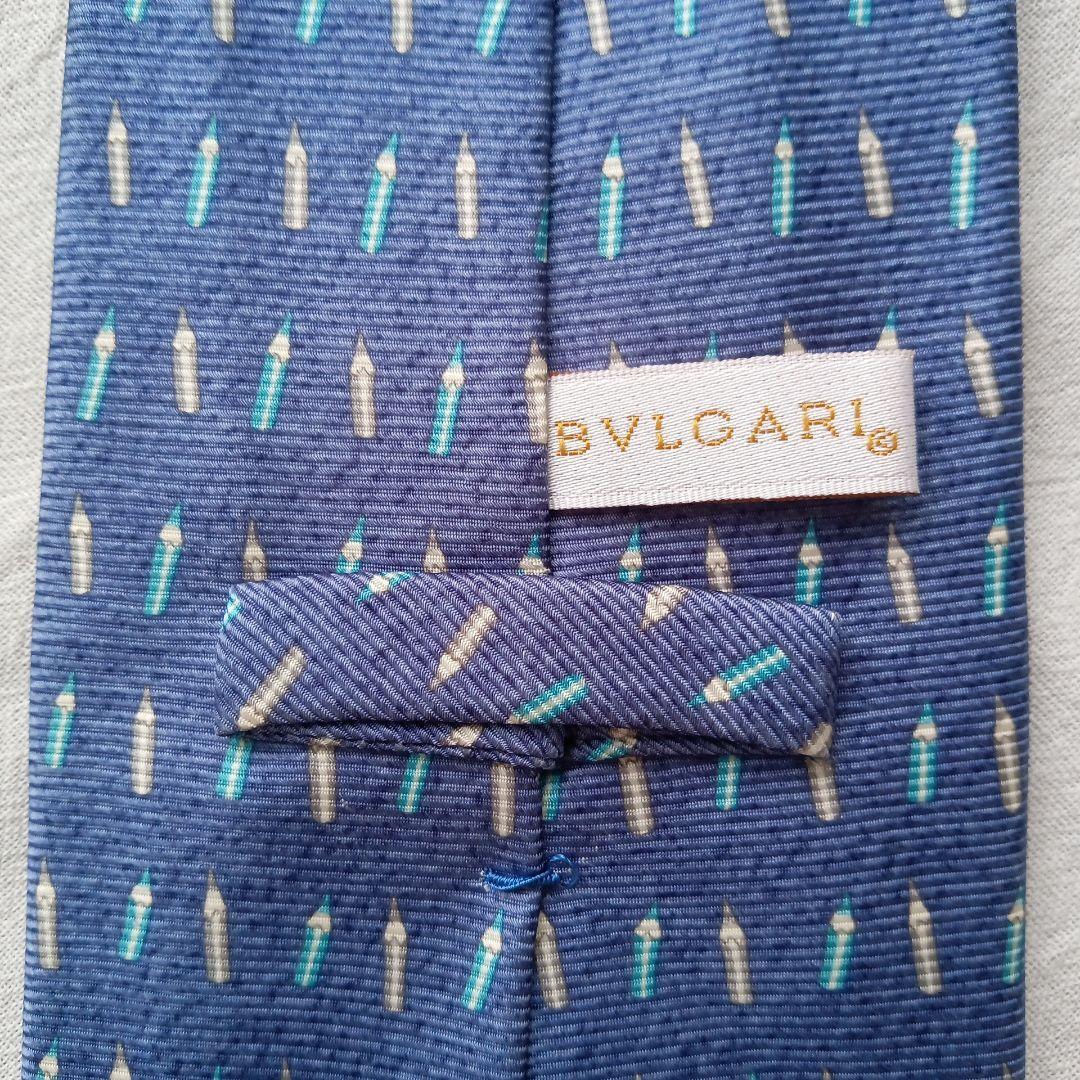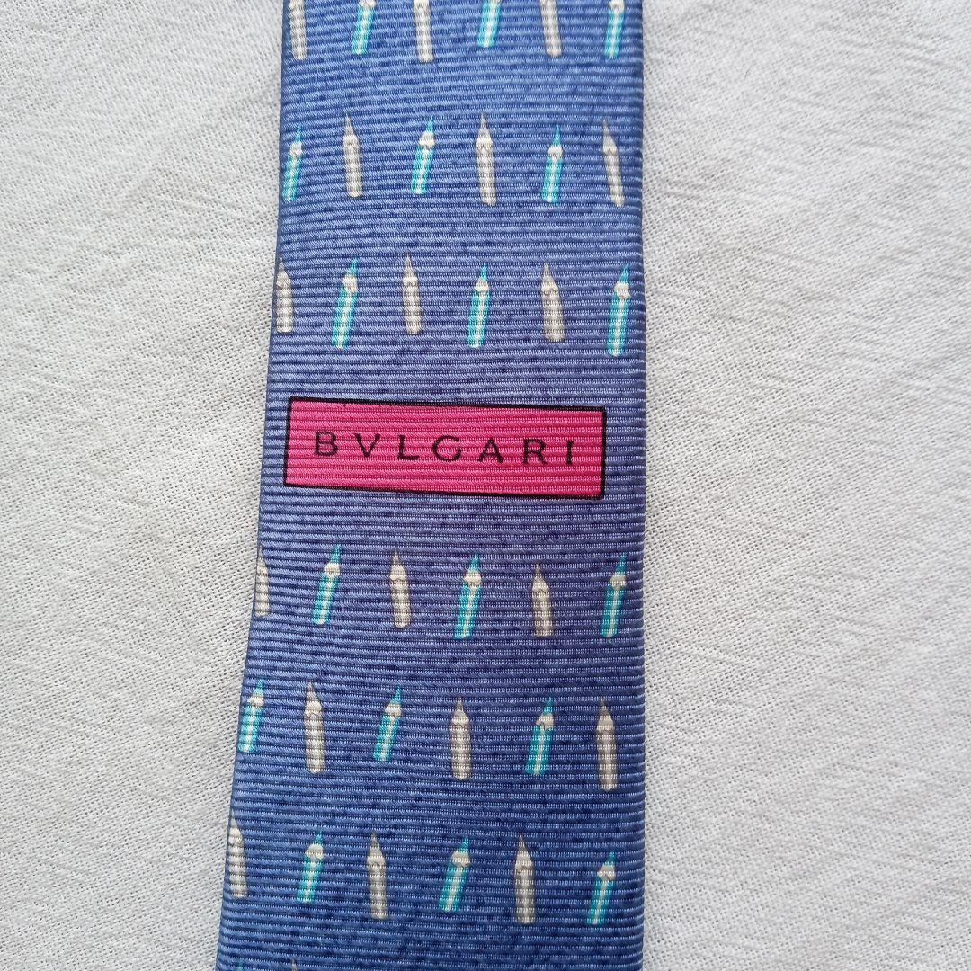 ブルガリの高級シルクネクタイです。青色を基調にペンシルモチーフの総柄がモダンで上品な印象を与えるデザイン。イタリア製ならではの上質な素材感と丁寧な縫製が魅力で、ビジネスからフォーマルまで活躍する一本です。写真をご確認の上ご検討ください。