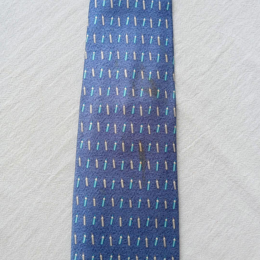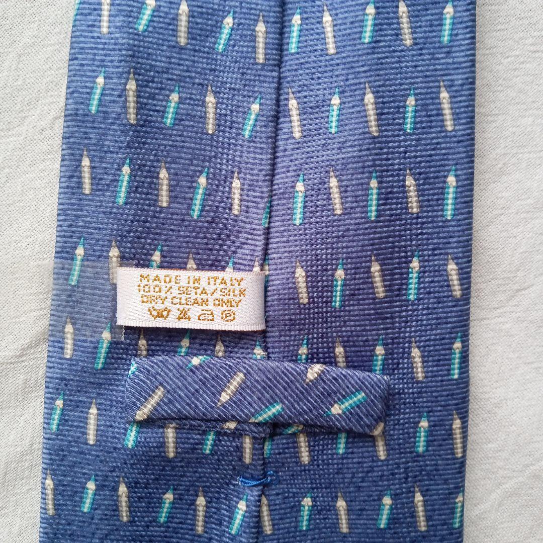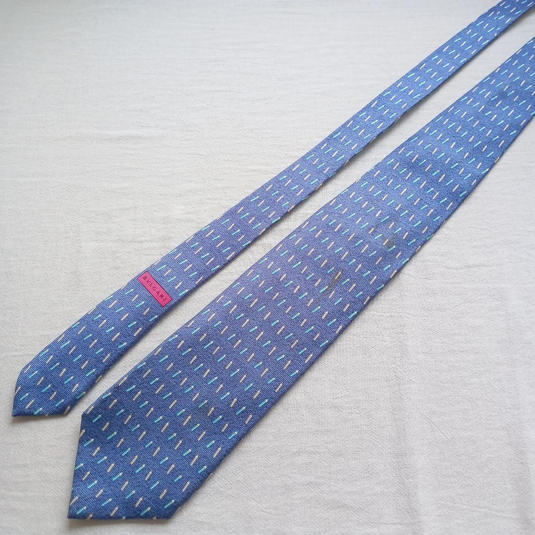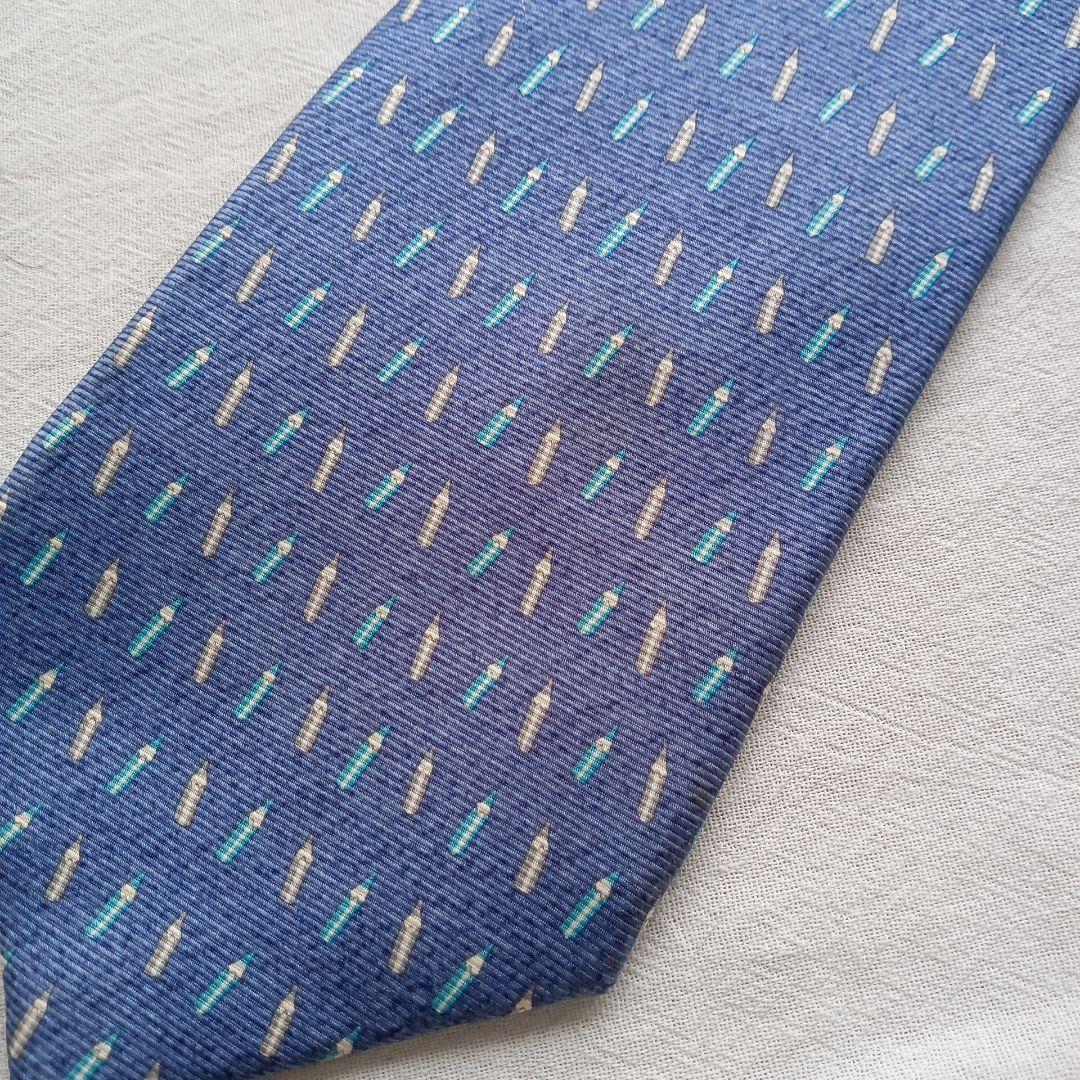 ブルガリの高級シルクネクタイです。青色を基調にペンシルモチーフの総柄がモダンで上品な印象を与えるデザイン。イタリア製ならではの上質な素材感と丁寧な縫製が魅力で、ビジネスからフォーマルまで活躍する一本です。写真をご確認の上ご検討ください。