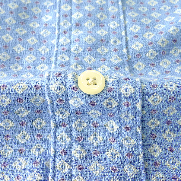 太いコットン糸を使用した、粗く平織りのパナマ織ダイヤ柄シャツです。 とても通気性が良くて、肌触りの良い生地感が特徴的です。 太い糸で粗く織るので、表面に凸凹感があり、肌との接触が少なく涼しげな一枚です。 |