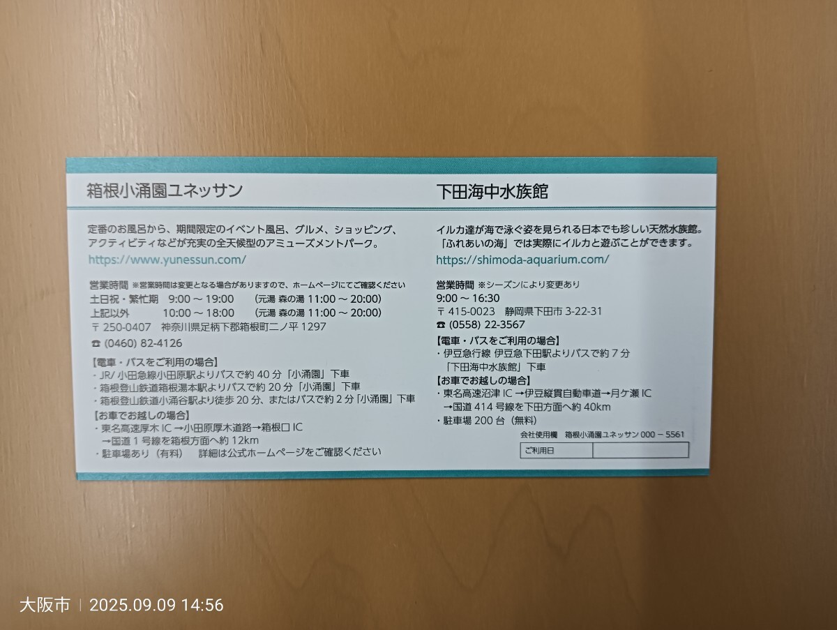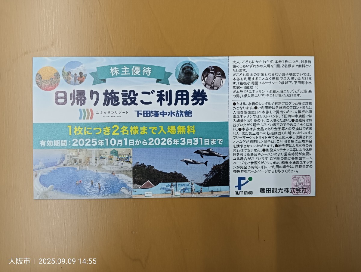 藤田観光 株主優待券 日帰り施設利用券 2枚セット 下田海中水族館 箱根小涌園ユネッサン 2026年3月31日