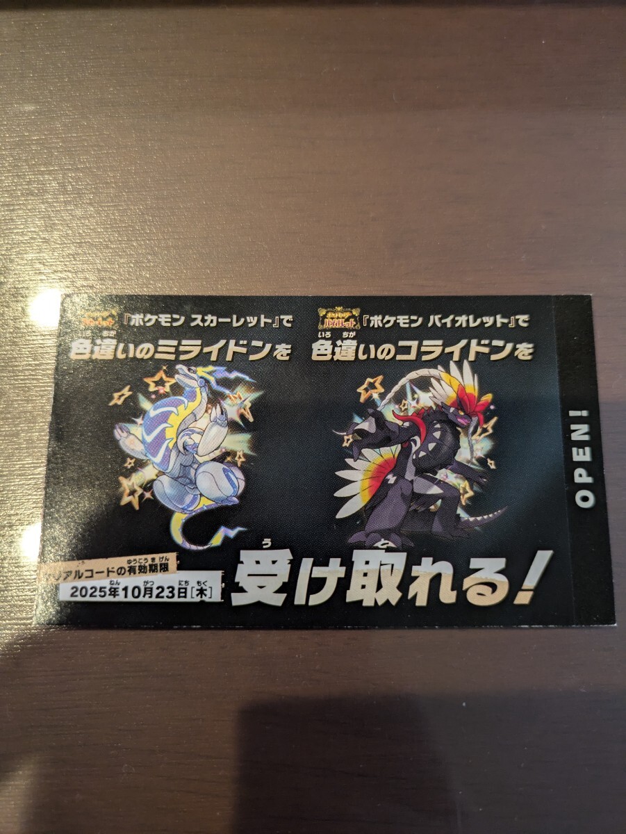 ポケモン スカーレット・バイオレットで色違いのミライドンとコライドンを受け取れるシリアルコードが記載されたカード1枚