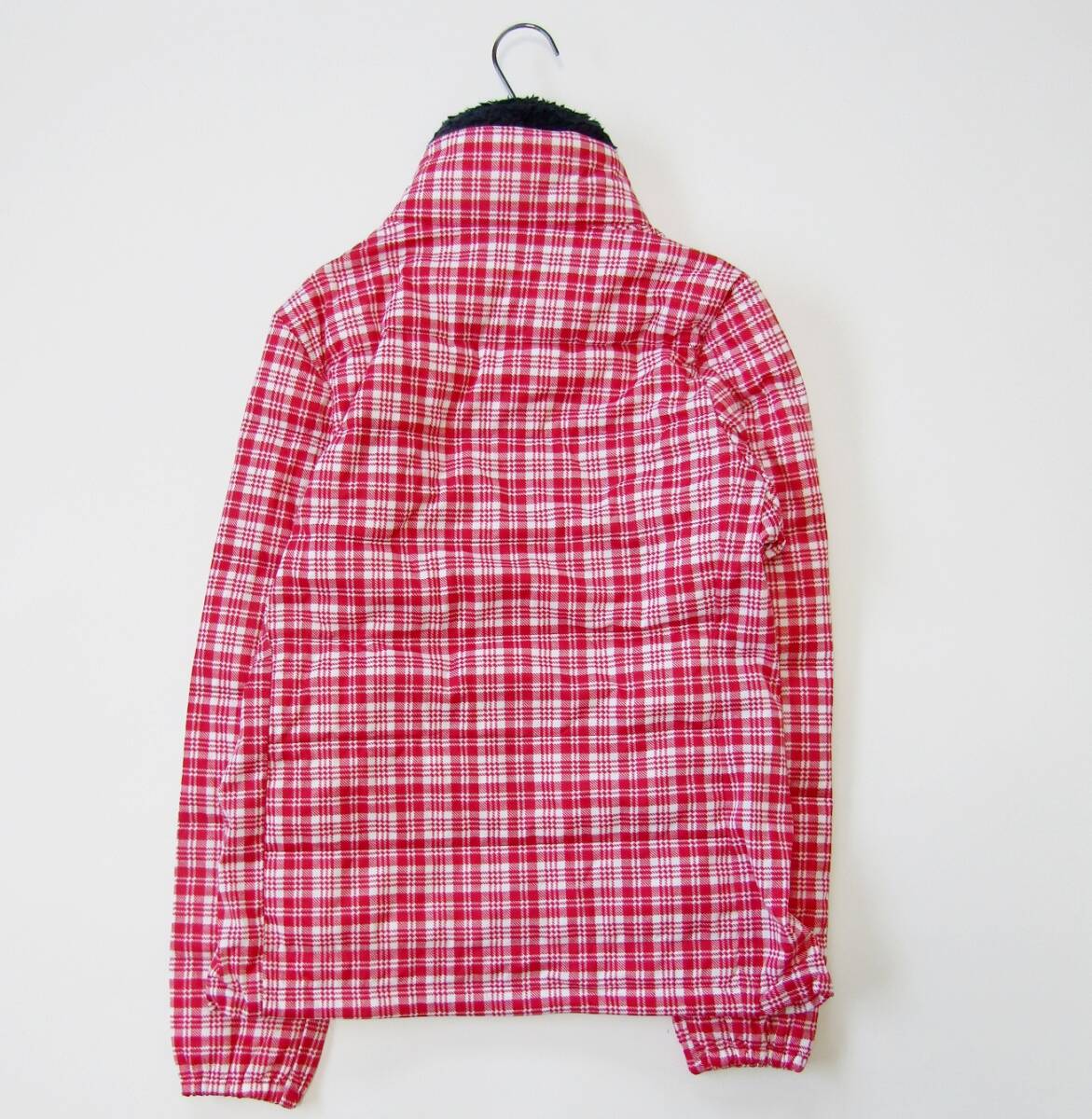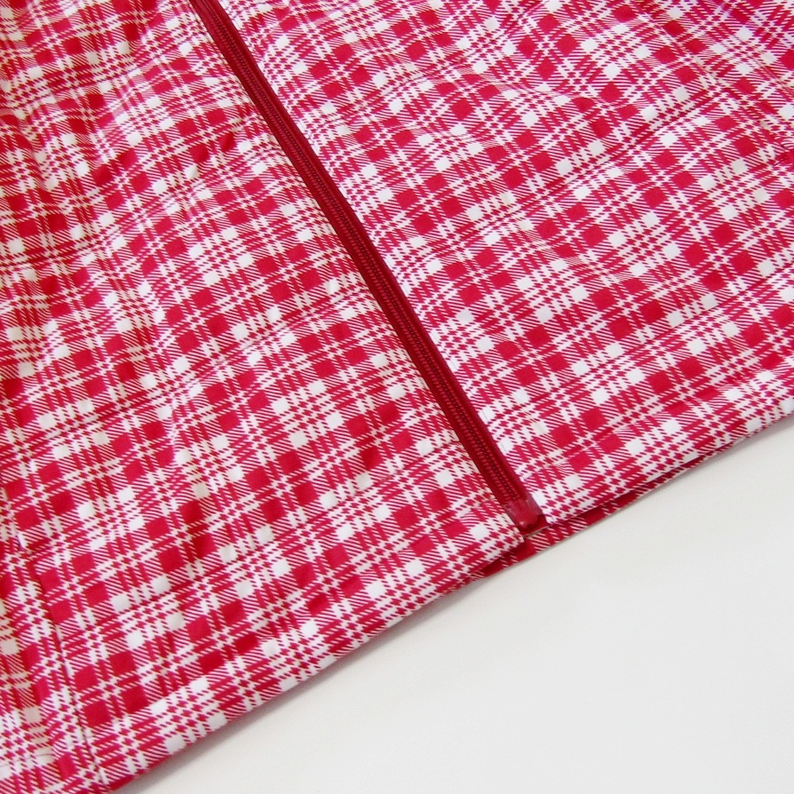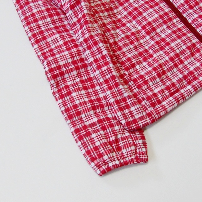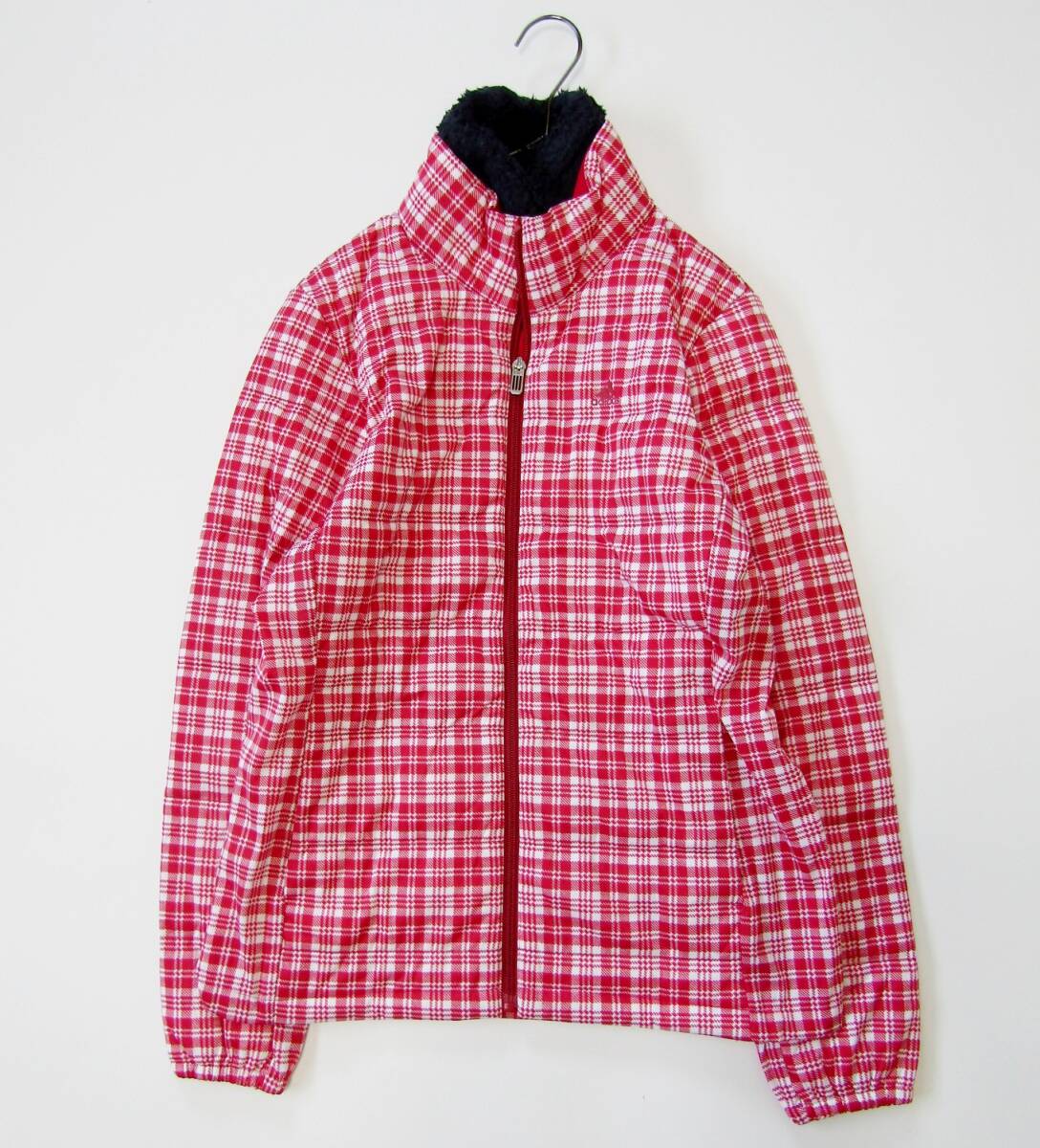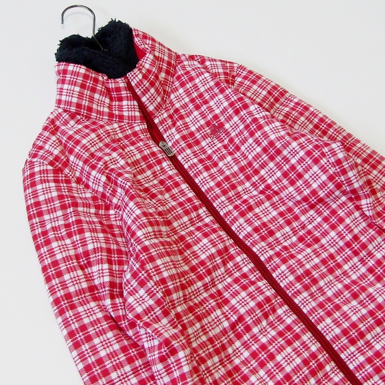 白と赤を基調としたチェック柄が華やかでスポーティーな印象を与え、冬のゴルフスタイルを明るく演出します。