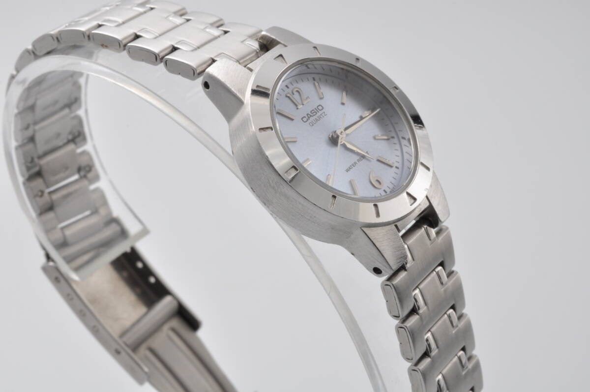 | ★商品説明★ | 商品説明 カシオのスタンダードなレディースアナログクォーツウォッチ、LTP-1177(モジュールNo. 1330)です。 シンプルながらも洗練されたデザインで、日常使いからオフィススタイルまで幅広く活躍します。 文字盤: 光の当たり方で表情を変える淡いブルー系の文字盤です。視認性の良いアラビア数字(12、6)とバーインデックスの組み合わせ。 ケース・ブレスレット: スタイリッシュなステンレススチール製のブレスレットとケースです。 状態: 目立つ大きな傷などはなく、年代を考慮すると非常にきれいな美品です。出品画像にてご確認をお願いします。 動作: 現在、正常に動作しています(クォーツムーブメント)。 ブランドCASIO (カシオ) モデル名LTP-1177 (裏蓋刻印あり) モジュールNo.1330 (裏蓋刻印あり) ムーブメントクォーツ (アナログ3針) ケース素材ステンレススチール / ブラス (検索情報による) ブレスレットステンレススチール (三つ折式バックルにCASIO刻印あり) 文字盤の色淡いブルー系/ライトグレー系 (バリエーションにより異なる場合があります) ガラスミネラルガラス 防水性能WATER RESISTANT (日常生活防水) ケースサイズ約25mm (リューズ除く、検索情報より) 腕周り約14cm (計測画像あり。若干の誤差はご容赦ください) 付属品なし (本体のみ) 製造国JAPAN MOV'T / CASED IN CHINA (裏蓋刻印あり) 付属品 付属品はありません。 電池交換済み ※画像のものがお譲りする全てとなります。 |