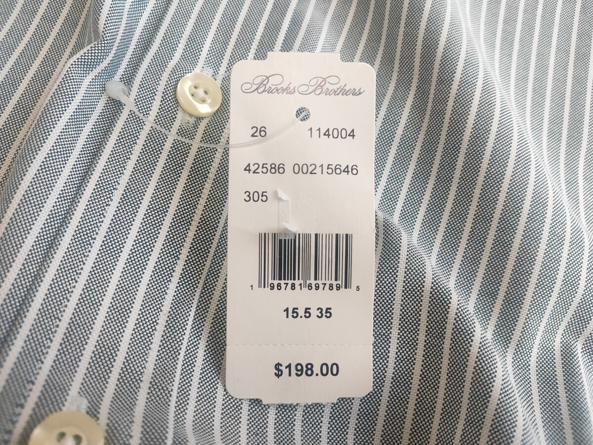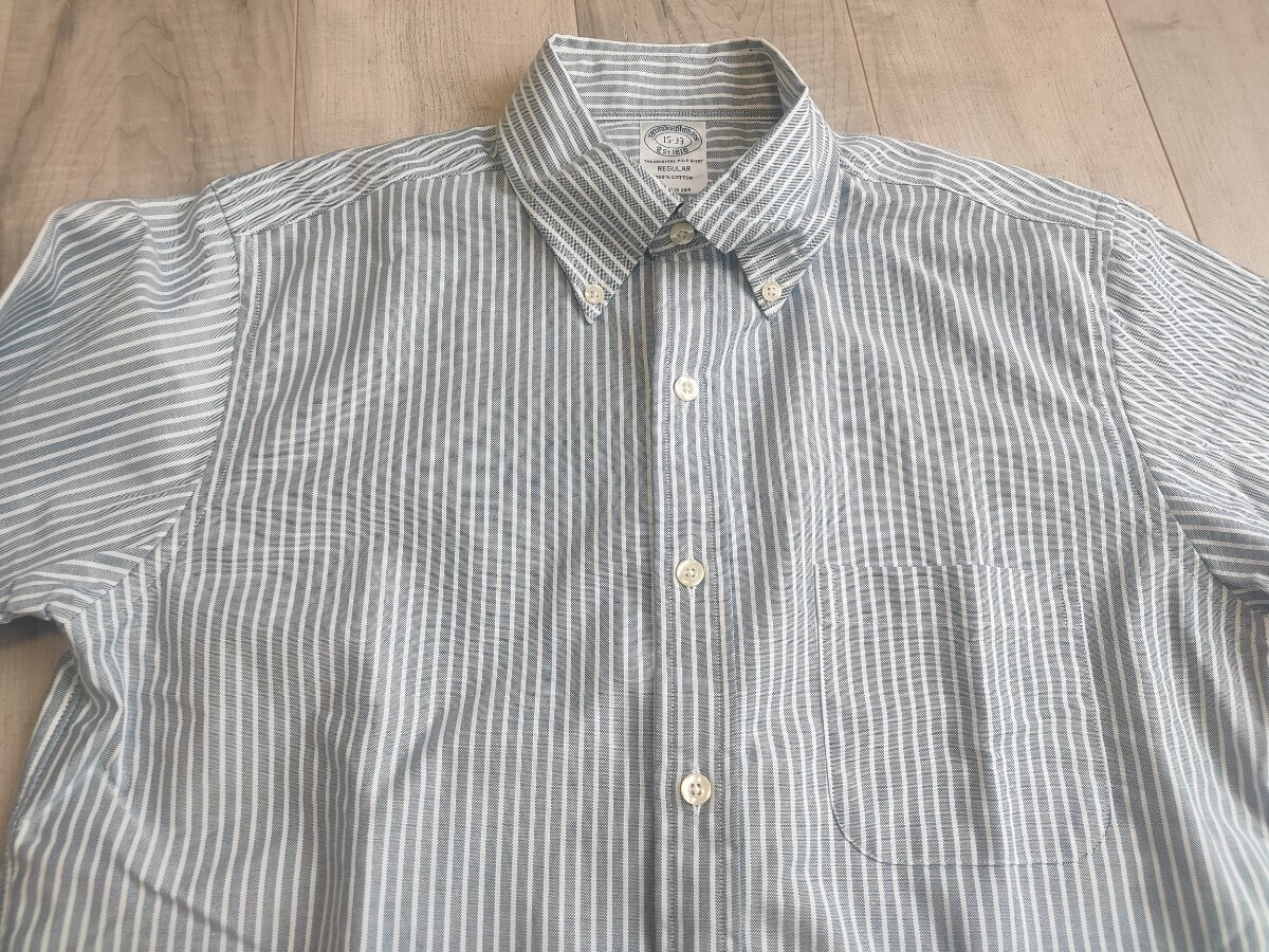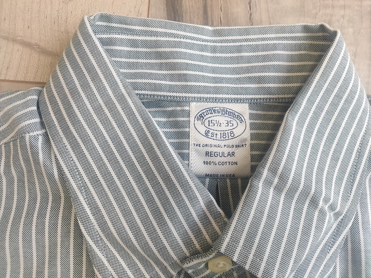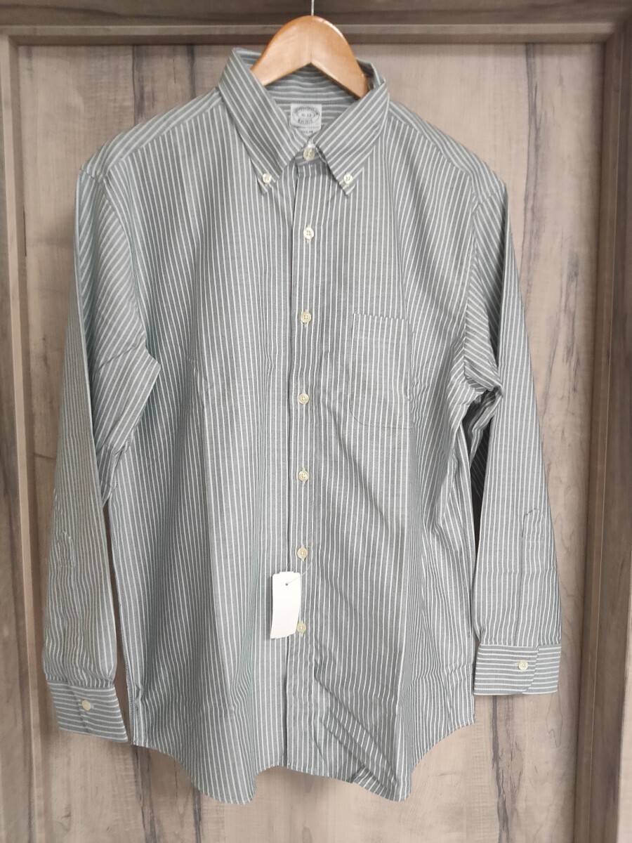BROOKS BROTHERSのストライプボタンダウンシャツです。色は緑×白、素材は100% COTTONのオックスフォード地です。アメリカ製です。近年のモデルです。