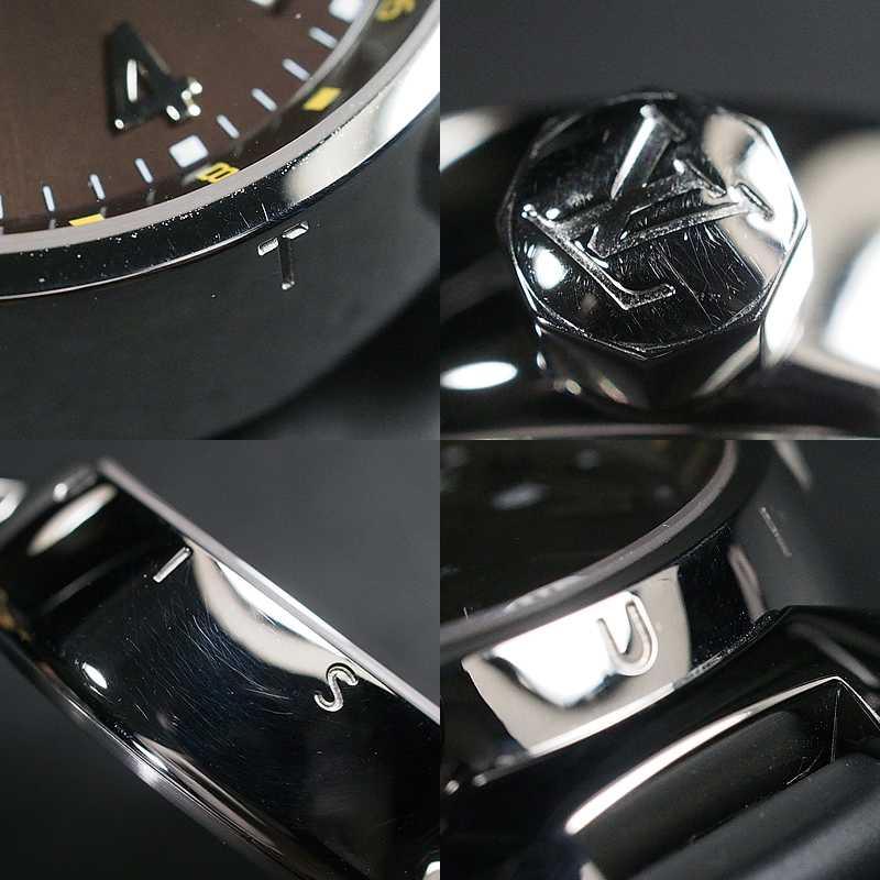 備考:性別問わず人気が高く、ヴィトンの定番として存在し続ける「タンブール」。こちらは、ブラウンダイヤルに鮮やかなイエローのGMT針が映えるモデルです。裏蓋に薄っすら小スレ、ベゼル・ケース・ラグ・リューズ・バンド・尾錠にスレがございますが、大きく目立つような傷は無く、状態の良いお品となっております。